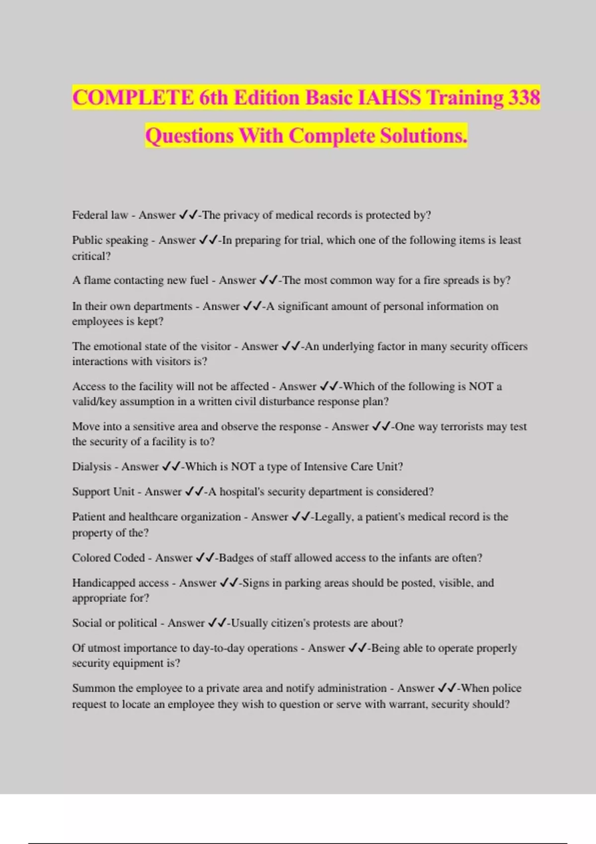 COMPLETE 6th Edition Basic IAHSS Training 338 Questions With Complete Solutions. Federal law - Answer ️️ -The privacy of medical records is protected by? Public speaking - Answer ️️ -In preparing for trial, which one of the following items is least critical? A flame contacting new fuel - Answer ️️ -The most common way for a fire spreads is by? In their own departments - Answer ️️ -A significant amount of personal information on employees is kept? The emotional state of the visitor - Answer ️️ -An underlying factor in many security officers interactions with visitors is? Access to the facility will not be affected - Answer ️️ -Which of the following is NOT a valid/key assumption in a written civil disturbance response plan? Move into a sensitive area and observe the response - Answer ️️ -One way terrorists may test the security of a facility is to? Dialysis - Answer ️️ -Which is NOT a type of Intensive Care Unit? Support Unit - Answer ️️ -A hospital's security department is considered? Patient and healthcare organization - Answer ️️ -Legally, a patient's medical record is the property of the? Colored Coded - Answer ️️ -Badges of staff allowed access to the infants are often? Handicapped access - Answer ️️ -Signs in parking areas should be posted, visible, and appropriate for? Social or political - Answer ️️ -Usually citizen's protests are about? Of utmost importance to day-to-day operations - Answer ️️ -Being able to operate properly security equipment is? Summon the employee to a private area and notify administration - Answer ️️ -When police request to locate an employee they wish to question or serve with warrant, security should? De-escalation - Answer ️️ -What ability or skill is most likely to achieve success in a potentially violent situation? Who, What, When, Where, Why, How - Answer ️️ -Which BEST describes the six fundamental answers all investigations seek? The scale of the incident - Answer ️️ -A person may be assigned one or several job action sheet assignments depending on? Information systems - Answer ️️ -All computers in the entire hospital are linked through? Observations and facts - Answer ️️ -The security officer's notebook contains? Freedom of assembly - Answer ️️ -The individual right to come together with others to express , promote, pursue, and defend common interests refers to? Tiny, combustible particles - Answer ️️ -The incipient stage of a fire produces Six - Answer ️️ -How many critical areas must an organization's Emergency Plan address? Human Resources - Answer ️️ -When a search of an employee's locker has been authorized, it should be conducted in the presence of the employee and a member of? Deterrence and emergency response - Answer ️️ -Which of the following are considered the two major roles of a security officer in preventing workplace violence? Notify the Nursing Supervisor - Answer ️️ -On routine patrol you find an unattended drug chart with the keys in the lock. You should first? The most important item of equipment an officer carries - Answer ️️ -A two-way radio is? Escalating healthcare costs combined with reductions in government funding - Answer ️️ -One of the reasons healthcare organizations have put more emphasis on public relations is? Bench-marking - Answer ️️ -The cost-effectiveness of the security functions and the justification of its expenses can be demonstrated through? Centers for Medicare and Medicaid Services - Answer ️️ -The loss of "deemed status" could stop reimbursement of revenue from the? Governmental regulations - Answer ️️ -Which of the following is NOT a reason healthcare organizations need security services? Pay Federal or State taxes - Answer ️️ -A not-for-profit healthcare organization does NOT generally? Govern the acts of private parties - Answer ️️ -Civil law is in