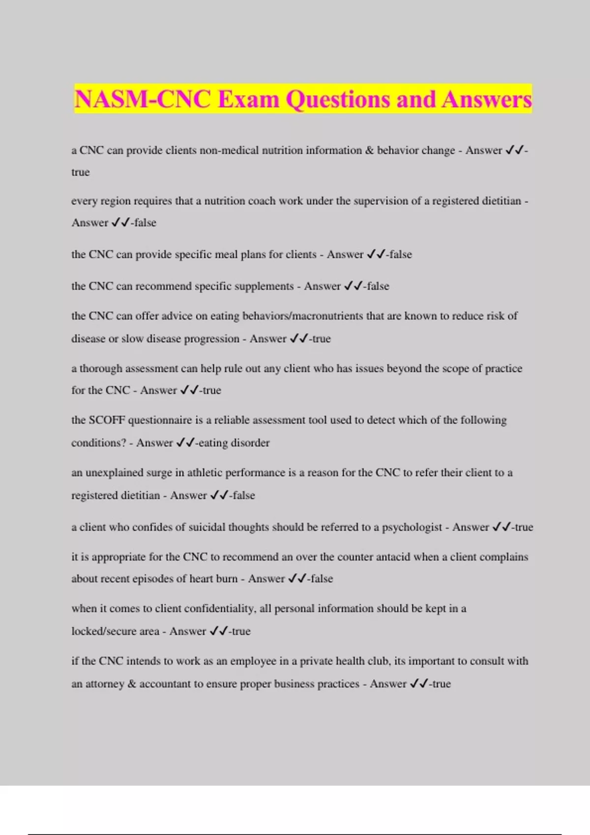 NASM-CNC Exam Questions and Answers a CNC can provide clients non-medical nutrition information & behavior change - Answer ️️ - true every region requires that a nutrition coach work under the supervision of a registered dietitian - Answer ️️ -false the CNC can provide specific meal plans for clients - Answer ️️ -false the CNC can recommend specific supplements - Answer ️️ -false the CNC can offer advice on eating behaviors/macronutrients that are known to reduce risk of disease or slow disease progression - Answer ️️ -true a thorough assessment can help rule out any client who has issues beyond the scope of practice for the CNC - Answer ️️ -true the SCOFF questionnaire is a reliable assessment tool used to detect which of the following conditions? - Answer ️️ -eating disorder an unexplained surge in athletic performance is a reason for the CNC to refer their client to a registered dietitian - Answer ️️ -false a client who confides of suicidal thoughts should be referred to a psychologist - Answer ️️ -true it is appropriate for the CNC to recommend an over the counter antacid when a client complains about recent episodes of heart burn - Answer ️️ -false when it comes to client confidentiality, all personal information should be kept in a locked/secure area - Answer ️️ -true if the CNC intends to work as an employee in a private health club, its important to consult with an attorney & accountant to ensure proper business practices - Answer ️️ -true when working with a client who has been complaining of low back pain that has been getting worse, what is the most appropriate recommendation - Answer ️️ -refer to a chiropractor common assessments performed by a CNC include height, weight, body composition & what other test? - Answer ️️ -anthropometric measurements where might a CNC find reputable information on recent dietary guidelines? - Answer ️️ - government funded agencies according to the SCOFF eating disorder assessment, what is the minimum number of positive answers which might indicate an eating disorder? - Answer ️️ -2