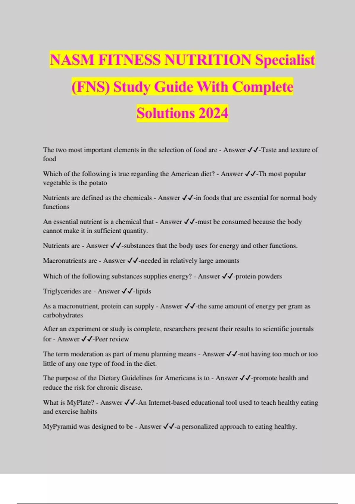 NASM FITNESS NUTRITION Specialist (FNS) Study Guide With Complete Solutions 2024 The two most important elements in the selection of food are - Answer ️️ -Taste and texture of food Which of the following is true regarding the American diet? - Answer ️️ -Th most popular vegetable is the potato Nutrients are defined as the chemicals - Answer ️️ -in foods that are essential for normal body functions An essential nutrient is a chemical that - Answer ️️ -must be consumed because the body cannot make it in sufficient quantity. Nutrients are - Answer ️️ -substances that the body uses for energy and other functions. Macronutrients are - Answer ️️ -needed in relatively large amounts Which of the following substances supplies energy? - Answer ️️ -protein powders Triglycerides are - Answer ️️ -lipids As a macronutrient, protein can supply - Answer ️️ -the same amount of energy per gram as carbohydrates After an experiment or study is complete, researchers present their results to scientific journals for - Answer ️️ -Peer review The term moderation as part of menu planning means - Answer ️️ -not having too much or too little of any one type of food in the diet. The purpose of the Dietary Guidelines for Americans is to - Answer ️️ -promote health and reduce the risk for chronic disease