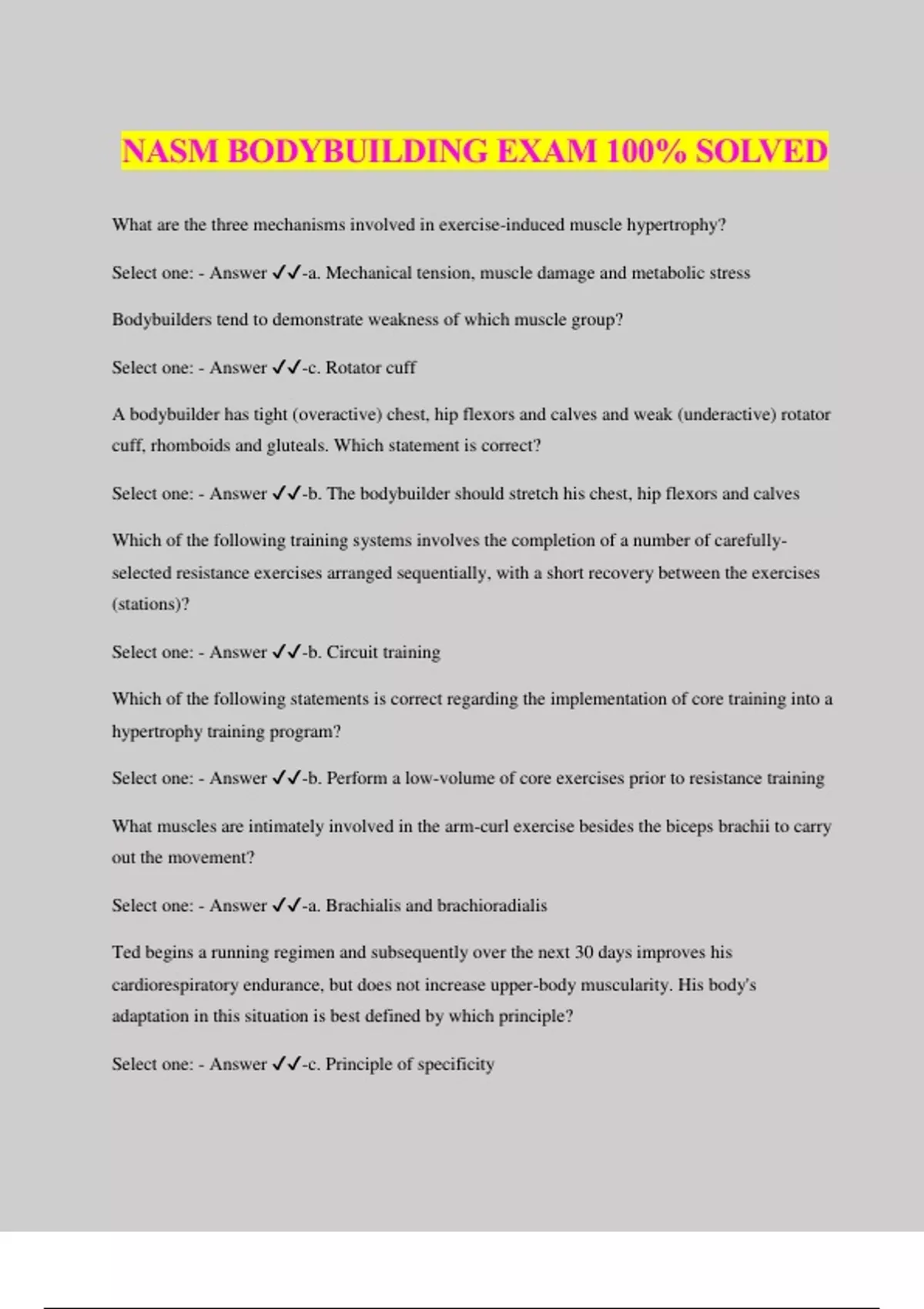 NASM BODYBUILDING EXAM 100% SOLVED What are the three mechanisms involved in exercise-induced muscle hypertrophy? Select one: - Answer ️️ -a. Mechanical tension, muscle damage and metabolic stress Bodybuilders tend to demonstrate weakness of which muscle group? Select one: - Answer ️️ -c. Rotator cuff A bodybuilder has tight (overactive) chest, hip flexors and calves and weak (underactive) rotator cuff, rhomboids and gluteals. Which statement is correct? Select one: - Answer ️️ -b. The bodybuilder should stretch his chest, hip flexors and calves Which of the following training systems involves the completion of a number of carefully- selected resistance exercises arranged sequentially, with a short recovery between the exercises (stations)? Select one: - Answer ️️ -b. Circuit training Which of the following statements is correct regarding the implementation of core training into a hypertrophy training program? Select one: - Answer ️️ -b. Perform a low-volume of core exercises prior to resistance training What muscles are intimately involved in the arm-curl exercise besides the biceps brachii to carry out the movement? Select one: - Answer ️️ -a. Brachialis and brachioradialis Ted begins a running regimen and subsequently over the next 30 days improves his cardiorespiratory endurance, but does not increase upper-body muscularity. His body's adaptation in this situation is best defined by which principle? Select one: - Answer ️️ -c. Principle of specificity Sally is a former bodybuilder who stopped training five years ago. Subsequently Sally has lost noticeable muscle size and body weight. Which