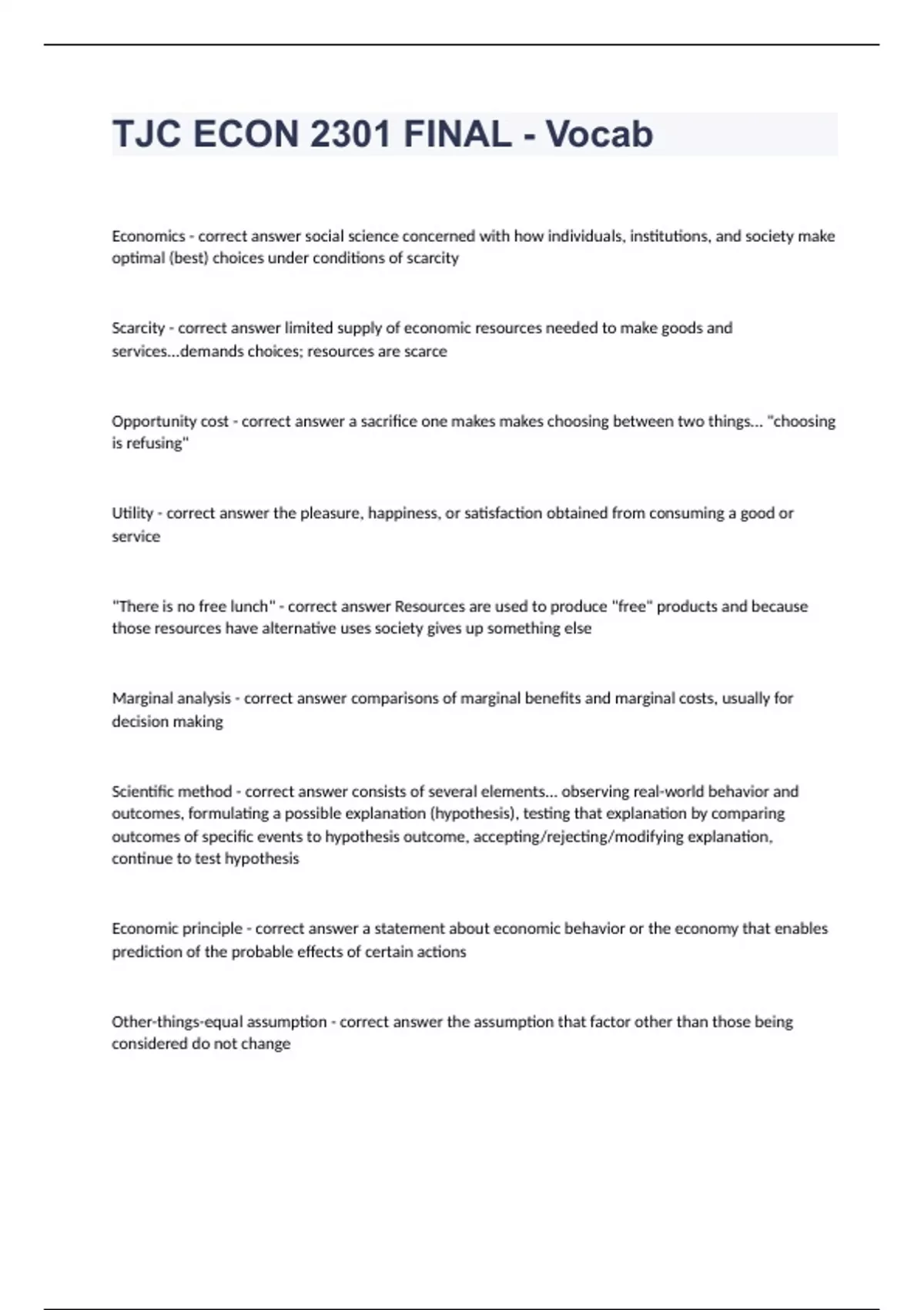 TJC ECON 2301 FINAL - Vocab Question and answers already passed 2023/2024Economics - correct answer social science concerned with how individuals, institutions, and society make optimal (best) choices under conditions of scarcity Scarcity - correct answer limited supply of economic resources needed to make goods and services...demands choices; resources are scarce Opportunity cost - correct answer a sacrifice one makes makes choosing between two things... "choosing is refusing" Utility - correct answer the pleasure, happiness, or satisfaction obtained from consuming a good or service "There is no free lunch" - correct answer Resources are used to produce "free" products and because those resources ha