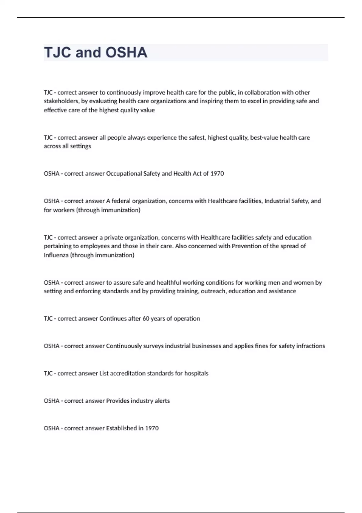 TJC and OSHA Question and answers 2023/2024 verified to pass TJC - correct answer to continuously improve health care for the public, in collaboration with other stakeholders, by evaluating health care organizations and inspiring them to excel in providing safe and effective care of the highest quality value TJC - correct answer all people always experience the safest, highest quality, best-value health care across all settings OSHA - correct answer Occupational Safety and Health Act of 1970 OSHA - correct answer A federal organization, concerns with Healthcare facilities, Industrial Safety, and for workers (through immunization) TJC - correct answer a private organization, concerns with Healthcare facilities safety and education pertaining to employees and those in their care. Also concerned with Prevention of the spread of Influenza (through immunization) OSHA - correct answer to assure safe and healthful working conditions for working men and women by setting and enforcing stand