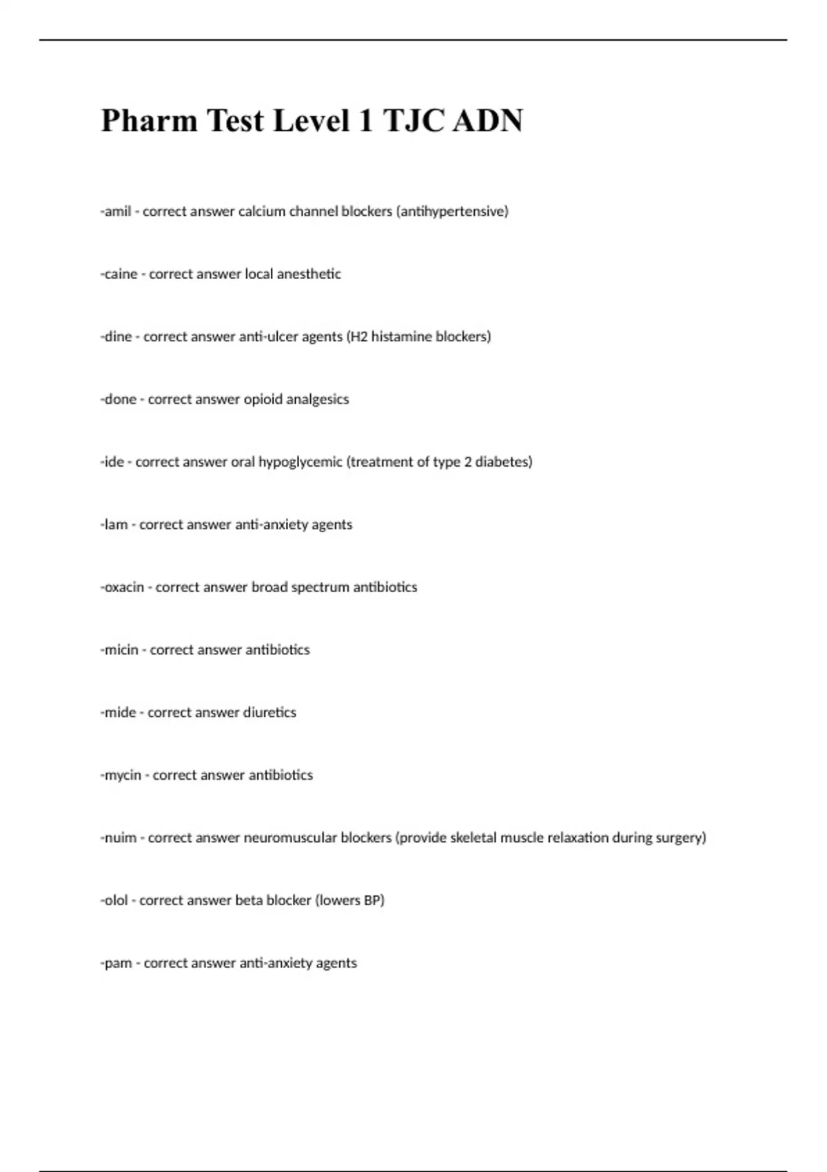 Pharm Test Level 1 TJC ADN Question and answers already passed 2023/2024-amil - correct answer calcium channel blockers (antihypertensive) -caine - correct answer local anesthetic -dine - correct answer anti-ulcer agents (H2 histamine blockers) -done - correct answer opioid analgesics -ide - correct answer oral hypoglycemic (treatment of type 2 diabetes) -lam - correct answer anti-anxiety agents -oxacin - correct answer broad spectrum antibiotics -micin - correct answer antibiotics -mide - correct answer diuretics -mycin - correct answer antibiotics -nuim - correct a