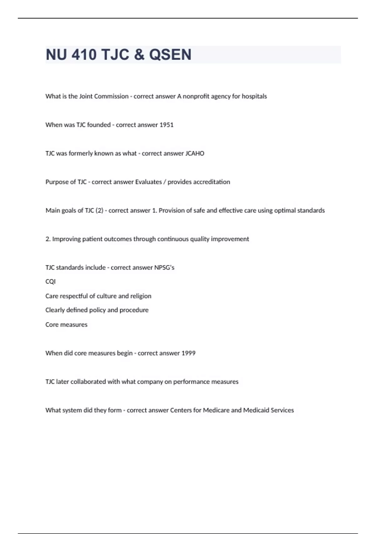 NU 410 TJC & QSEN Question and answers 2023/2024 verified to passWhat is the Joint Commission - correct answer A nonprofit agency for hospitals When was TJC founded - correct answer 1951 TJC was formerly known as what - correct answer JCAHO Purpose of TJC - correct answer Evaluates / provides accreditation Main goals of TJC (2) - correct answer 1. Provision of safe and effective care using optimal standards 2. Improving patient outcomes through continuous quality improvement TJC standards include - correct answer NPSG's CQI Care respectful of cultu