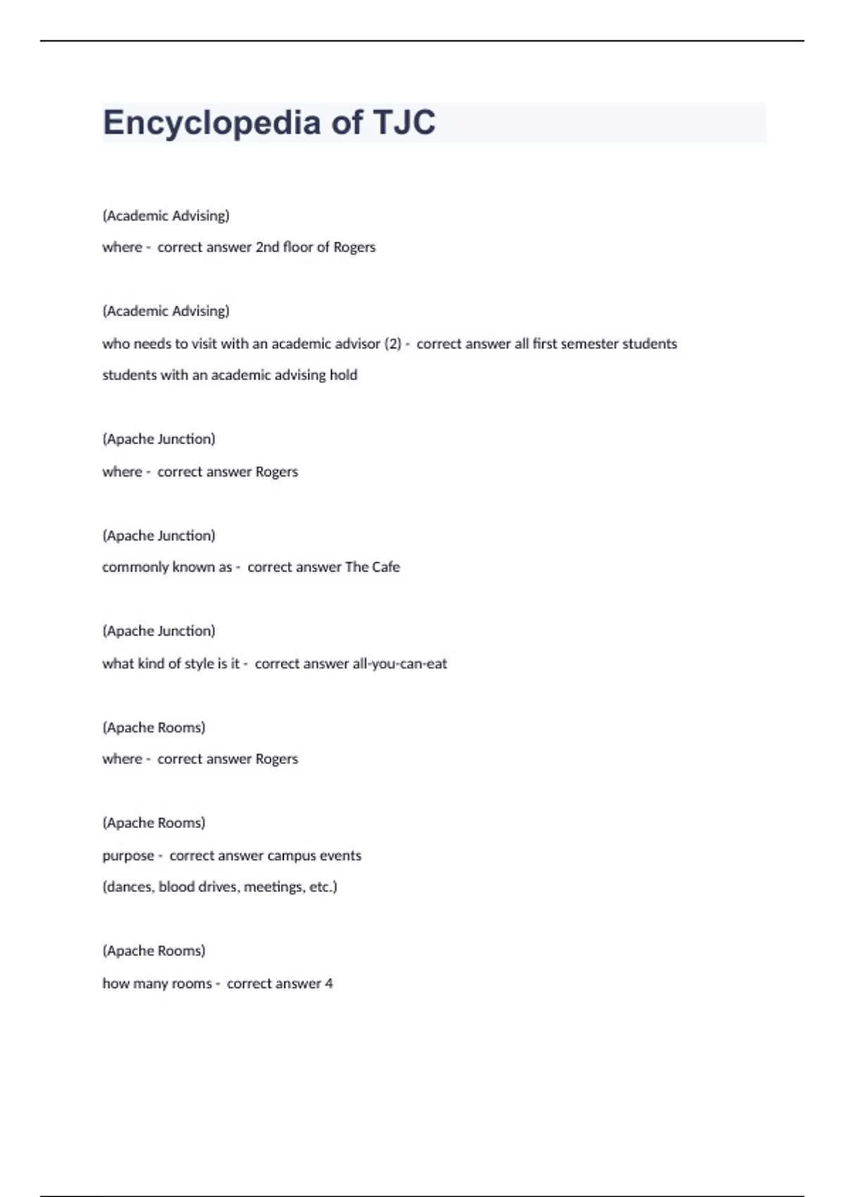 Encyclopedia of TJC Question and answers 100% correct 2023/2024 (Academic Advising) where - correct answer 2nd floor of Rogers (Academic Advising) who needs to visit with an academic advisor (2) - correct answer all first semester students students with an academic advising hold (Apache Junction) where - correct answer Rogers (Apache Junction) commonly known as - correct answer The Cafe (Apache Junction) what kind of style is it - correct answer all-you-can-eat (Apache Rooms) where - correct answer Rogers