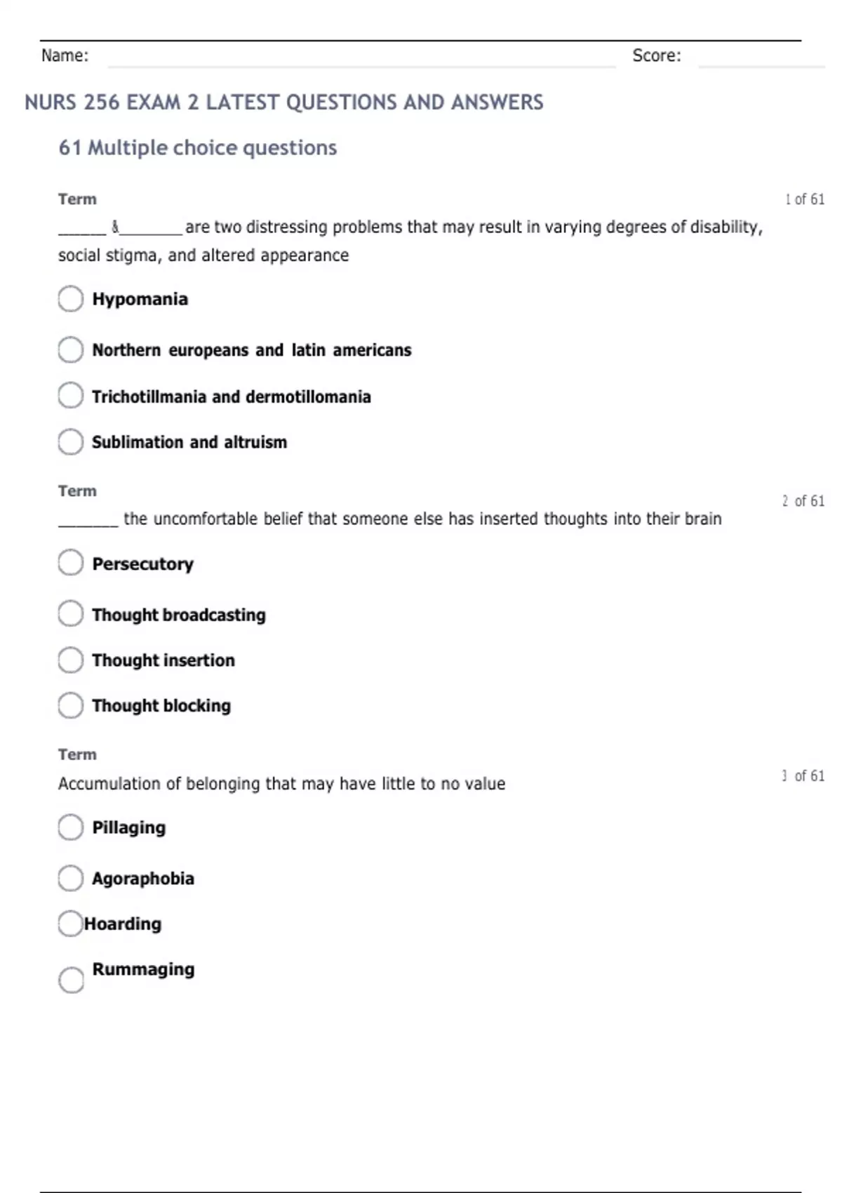 NURS 256 EXAM 2 LATEST QUESTIONS AND ANSWERS 61 Multiple choice questions Term _________ & _______________ are two distressing problems that may result in varying degrees of disability, social stigma, and altered appearance Hypomania Northern europeans and latin americans Trichotillmania and dermotillomania Sublimation and altruism Term _______ the uncomfortable belief that someone else has inserted thoughts into their brain Persecutory Thought broadcasting Thought insertion Thought blocking Term Accumulation of belonging that may have little to no value Pillaging Agoraphobia Hoarding Rummaging 1 of 61 2 of 61 3 of 61 Name: Score: Term What is the therapeutic range for lithium levels? 12-16 meq/l 1-1.5 meq/l 0.6-1.2 mEq/L 0.1-0.4 meq/l Term ___________ urgent or intense speech. Resists allowing comments from others Psychological stressors Pressured speech Flight of ideas Generalized anxiety Term _________ delusion: Believing another person desires you romantically. Somatic Grandiose Erotomanic Persecutory 4 of 61 5 of 61 6 of 61 Term Physical stressors Endorphins response Panic Psychological stressors Environmental conditions such as trama, excessive cold or heat as well as physical conditions such as infection, hunger, or hemorrhage. 7 of 61 Term Persistent, irrational fear of a specific object, activity or situation that leads to a desire for avoidance. Specific phobia Generalized anxiety Agoraphobia Social anxiety Term 8 of 61 9 of 61 Characterized by obsession and compulsions that develop with the use of a substance or within a month of stopping use of the substance. Drugs used to treat parkinson's have been reported to cause obsessions with gambling, or irresistible urges for sex Psychological stressors Substance induced anxiety Induced obsessive compulsive and related disorders. Cognitive retardation Term 10 of 61 Normal part of infant development and begins around 8 months and peaks at 18 months. This may be developed after a significant distress such as death of a loved one, pet, or an illness. Separation anxiety Agoraphobia Generalized anxiety Social anxiety Term 11 of 61 Panic attacks in __________ & ___________ often involve sensations of choking, smothering, numbness, or tingling as well as a fear of dying. Trichotillmania and Dermotillomania Hypomania Northern Europeans and Latin Americans Neologisms Term 12 of 61 Childhood experiences, coping strategies, and personal outlook on life and the world can form unique personalities with specific strengths and vulnerabilities What is perception? Individual temperament Insecure attahcment Strange situation Term Pacing, shouting and withdrawal occurs. Mania Moderate Anxiety Generalized Anxiety Panic Term ___________ delusion believes that the body is changing in unusual ways Erotomanic Persecutory Somatic Mania Term Initial and brief and adaptive (fight or flight) to the stressor Alarm stage Exhaustion stage Individual temperament Resistance stage 13 of 61 14 of 61 15 of 61 Term during this time that sustained and optimal resistance to the stressor occurs Allostatic load Exhaustion stage Resistance stage Alarm stage Term 16 of 61 17 of 61 ________ words that have meaning for the patient but different or non-existent meaning to others. Somatic Flight Of Ideas Neologisms Echolalia Term The cortex and the hypothalamus signal the adrenal glands to release the adrenaline Endorphin response Relaxation response Somatic nervous system Sympathetic response 18 of 61 Term 19 of 61 _______ delusion: a belief that events or circumstance that have no connection to you are somehow related to Persecutory Referential Nihilistic Grandiose Term 20 of 61 perceptual field is greatly reduced, may focus on one detail or many scattered details, inability to process what is going on and may lose touch with reality. Behavior includes: pacing, shouting, running, screaming, or withdrawal. Hallucinations or false perception may occur. panic mild anxiety generalized anxiety mania Term _______ delusion: believing that one is a very powerful or important person. Persecutory Grandiose Erotomanic Somatic 21 of 61 Term What're the different types of delusions? Sublimation and altruism Persecutory, referential, grandiose, erotomanic, nigilistic, somatic, control Psychological stressors Cognitive retardation Term _________ delusion: the conviction that a major catatrophe will occur Persecutory Grandiose Nihilistic Somatic Term ____________ delusion believes another person, group of individuals or external force controls thoughts, feelings, impulses, or behavior. Somatic Control Erotomanic Dependent Variable 22 of 61 23 of 61 24 of 61 Term resistance the stressor proves to be futile Alarm Stage Exhaustion Depression Persecutory Term 25 of 61 26 of 61 _______ a reduction or stoppage of thoughts. Interruption of thought by hallucinations can cause this Thought blocking Thought deletion Flight of ideas Thought insertion Term 27 of 61 ___________ are divined as thoughts, impulses, or images that persist and recur so that they cannot be dismissed from the mind even through the individual attempts to do so. Obsessions often seem senseless. Social Anxiety Obsessions Mania Compulsions Term 28 of 61 a period of intense mood disturbance with persistent elevation, expansiveness, irritability, and extreme goal-directed activity or energy. A person often gives away money, prized possessions, and expensive gifts. Distractibility is a hallmark symptom of mania. Individuals may be manipulative, profane, faultfinding, and skilled at detecting and then exploiting others' vulnerabilities. Agoraphobia Flight Of Ideas Mania Persecutory Term During the alarm phase of stress, what two systems interaction Resistance stage Immune system and nervous system Generalized anxiety Substance induced anxiety Term Perceptual field narrows. Only certain details are retained Moderate anxiety Severe anxiety Panic Agoraphobia 29 of 61 30 of 61 Term 31 of 61 ________ generalized slowing of thinking which is 
