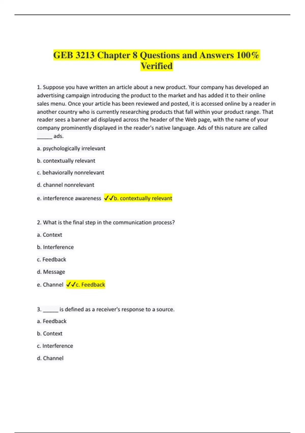 1. Suppose you have written an article about a new product. Your company has developed an advertising campaign introducing the product to the market and has added it to their online sales menu. Once your article has been reviewed and posted, it is accessed online by a reader in another country who is currently researching products that fall within your product range. That reader sees a banner ad displayed across the header of the Web page, with the name of your company prominently displayed in the reader's native language. Ads of this nature are called _____ ads. a. psychologically irrelevant b. contextually relevant c. behaviorally nonrelevant d. channel nonrelevant e. interference awareness b. contextually relevant 2. What is the final step in the communication process? a. Context b. Interference c. Feedback d. Message e. Channel c. Feedback 3. _____ is defined as a receiver's response to a source. a. Feedback b. Context c. Interference d. Channel