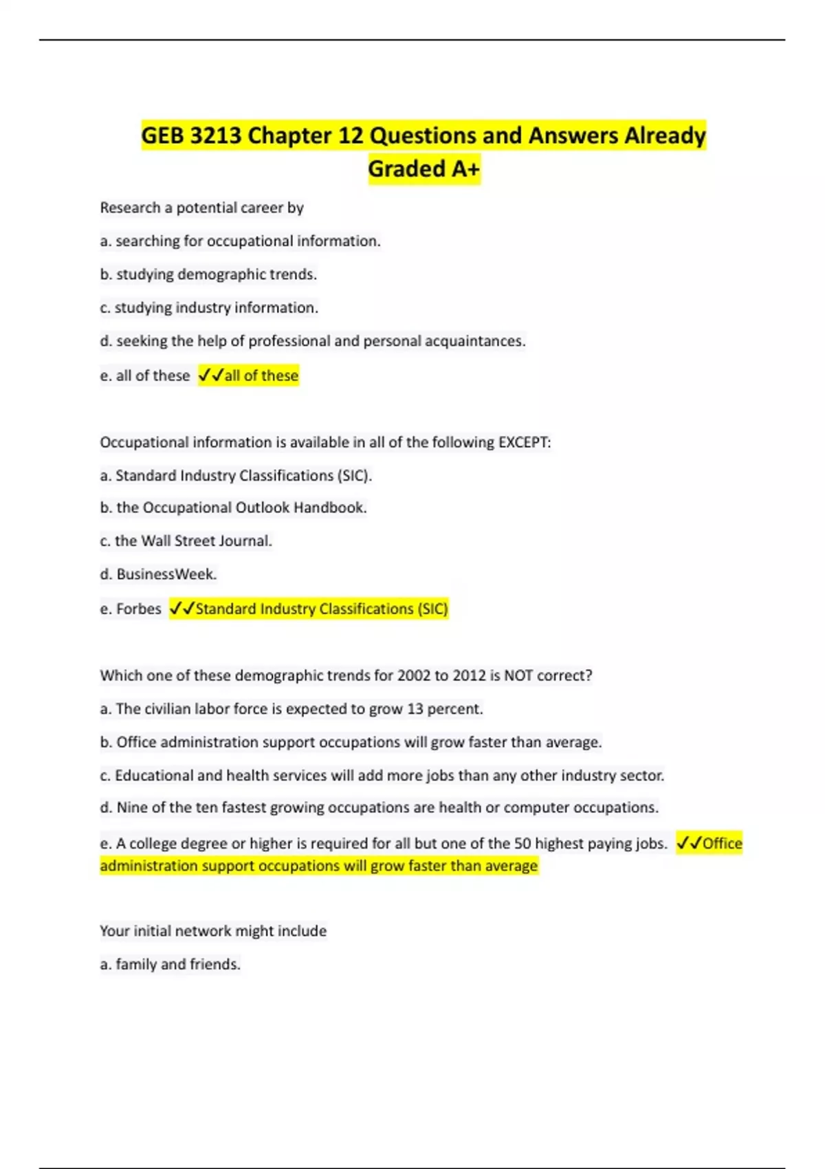 Research a potential career by a. searching for occupational information. b. studying demographic trends. c. studying industry information. d. seeking the help of professional and personal acquaintances. e. all of these all of these Occupational information is available in all of the following EXCEPT: a. Standard Industry Classifications (SIC). b. the Occupational Outlook Handbook. c. the Wall Street Journal. d. BusinessWeek. e. Forbes Standard Industry Classifications (SIC) Which one of these demographic trends for 2002 to 2012 is NOT correct? a. The civilian labor force is expected to grow 13 percent. b. Office administration support occupations will grow faster than average. c. Educational and health services will add more jobs than any other industry sector. d. Nine of the ten fastest growing occupations are health or computer occupations. e. A college degree or higher is required for all but one of the 50 highest paying jobs. Office administration support occupations will grow faster than average