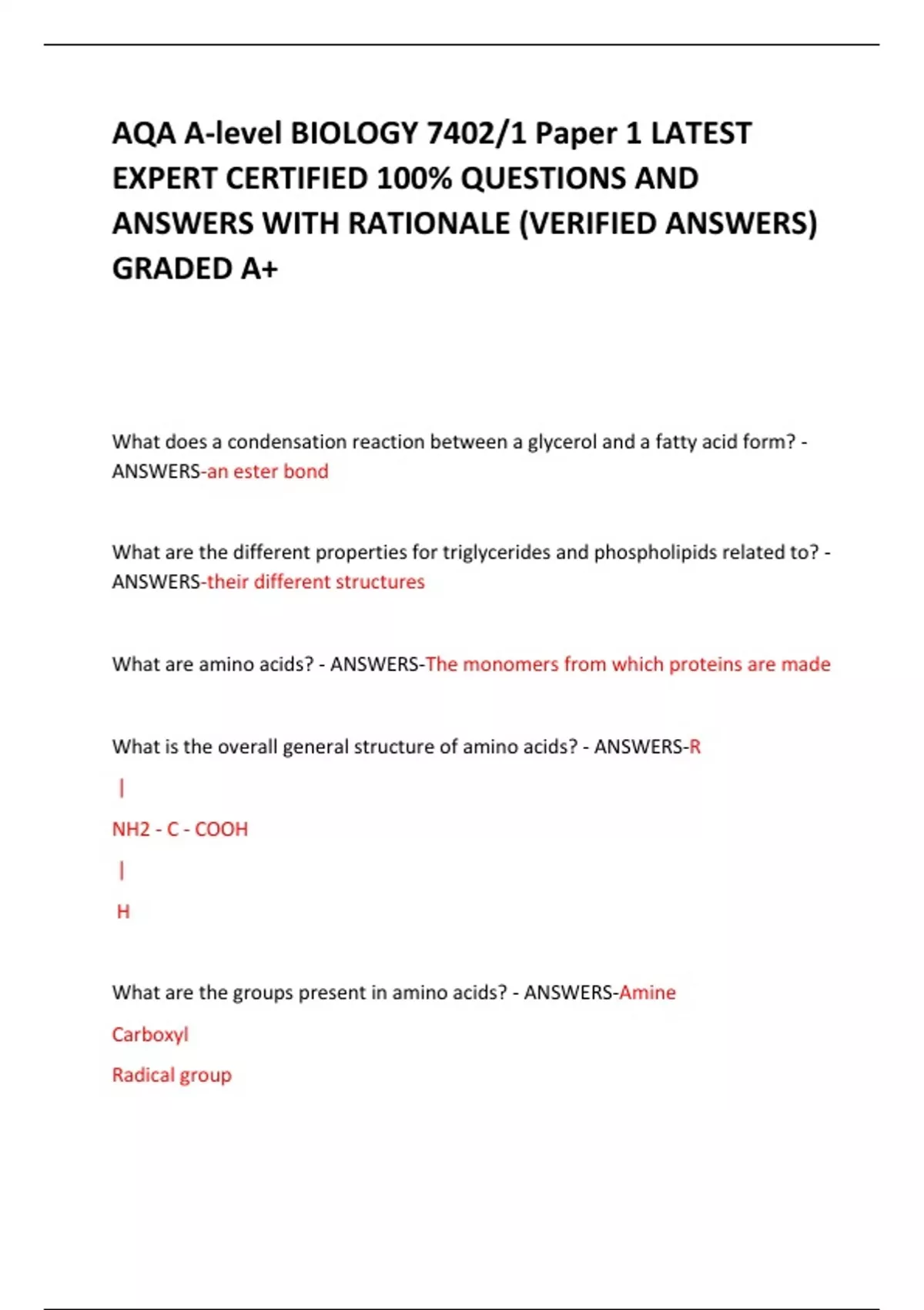 AQA A-level BIOLOGY 7402/1 Paper 1 LATEST EXPERT CERTIFIED 100% QUESTIONS AND ANSWERS WITH RATIONALE (VERIFIED ANSWERS) GRADED A+