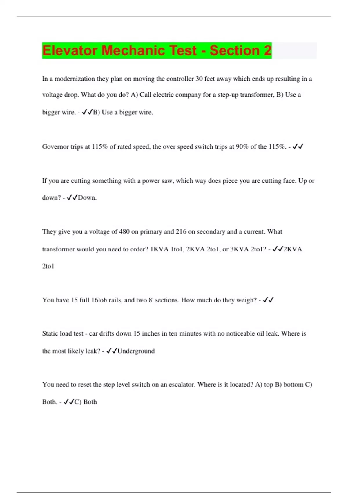Elevator Mechanic Test - Section 2 Questions with 100% Correct Answers | Latest Update 2024 | Verified