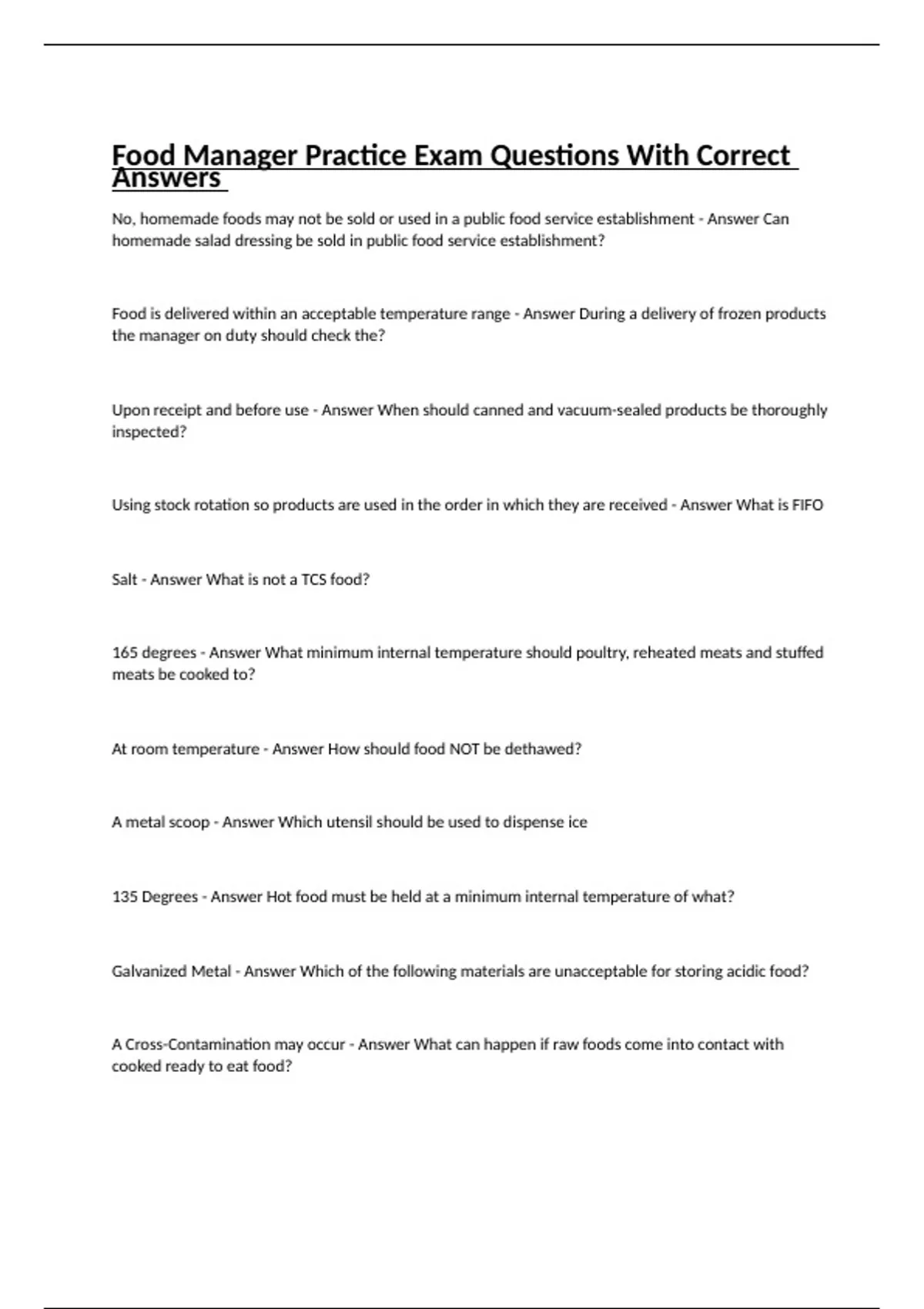 No, homemade foods may not be sold or used in a public food service establishment - Answer Can homemade salad dressing be sold in public food service establishment? Food is delivered within an acceptable temperature range - Answer During a delivery of frozen products the manager on duty should check the? Upon receipt and before use - Answer When should canned and vacuum-sealed products be thoroughly inspected? Using stock rotation so products are used in the order in which they are received - Answer What is FIFO Salt - Answer What is not a TCS food? 165 degrees - Answer What minimum internal temperature should poultry, reheated meats and stuffed meats be cooked to? At room temperature - Answer How should food NOT be dethawed? A metal scoop - Answer Which utensil should be used to dispense ice 135 Degrees - Answer Hot food must be held at a minimum internal temperature of what? Galvanized Metal - Answer Which of the following materials are unacceptable for storing acidic food? A Cross-Contamination may occur - Answer What can happen if raw foods come into contact with cooked ready to eat food? Frequent and effective handwashing - Answer Which of the following is the best way to prevent cross contamination? Holding all potentially hazardous foods at 41 degrees or below - Answer Which of the following procedures is acceptable in a public food service establishment? Eating or smoking might contaminate their hands - Answer Employees are prohibited from smoking and eating while at work because? Raw Chicken - Answer What food is primarily associated with the bacteria Salmonella? Allow the employee to work, UNLESS they have another communicable disease - Answer What is a acceptable practice when dealing with a food service worker who has HIV or AIDS Wash the wound, use a water resistant bandage and cover the bandage with a single use glove or finger cot - Answer What should you do if an employee has a minor cut? Only in designated handwashing areas - Answer Which of the following is an acceptable area for employee handwashing? Single use disposable paper towels - Answer Which of the following is an acceptable method for hand drying? Human ears, skin, nose and throat of an otherwise healthy person - Answer What is the source of Staphylococcus? Placing raw meat on the top shelf in storage - Answer What has a higher risk of causing cross contamination Hairnet - Answer What is an acceptable hair restraint for employees?