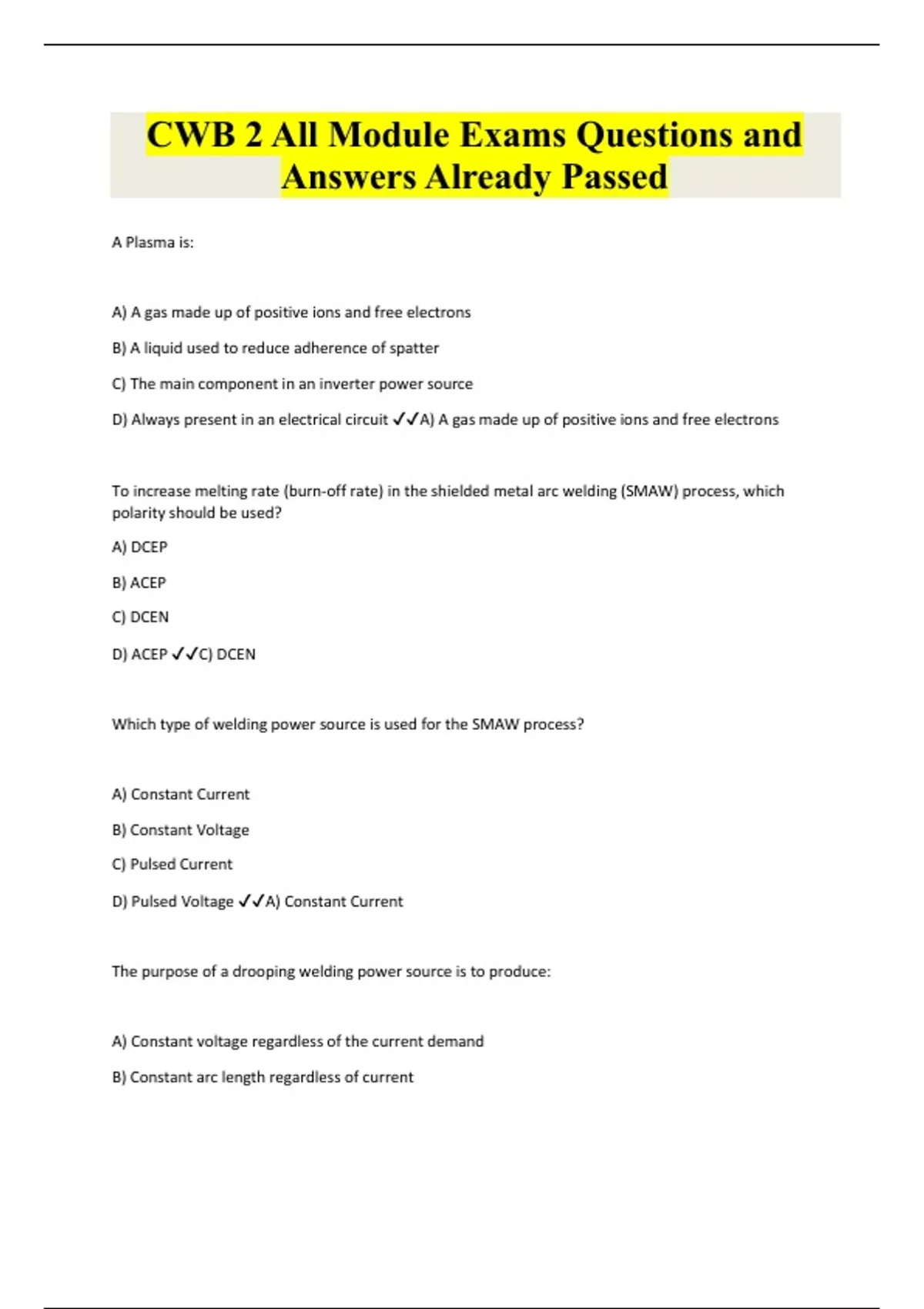 A Plasma is: A) A gas made up of positive ions and free electrons B) A liquid used to reduce adherence of spatter C) The main component in an inverter power source D) Always present in an electrical circuit A) A gas made up of positive ions and free electrons To increase melting rate (burn-off rate) in the shielded metal arc welding (SMAW) process, which polarity should be used? A) DCEP B) ACEP C) DCEN D) ACEP C) DCEN