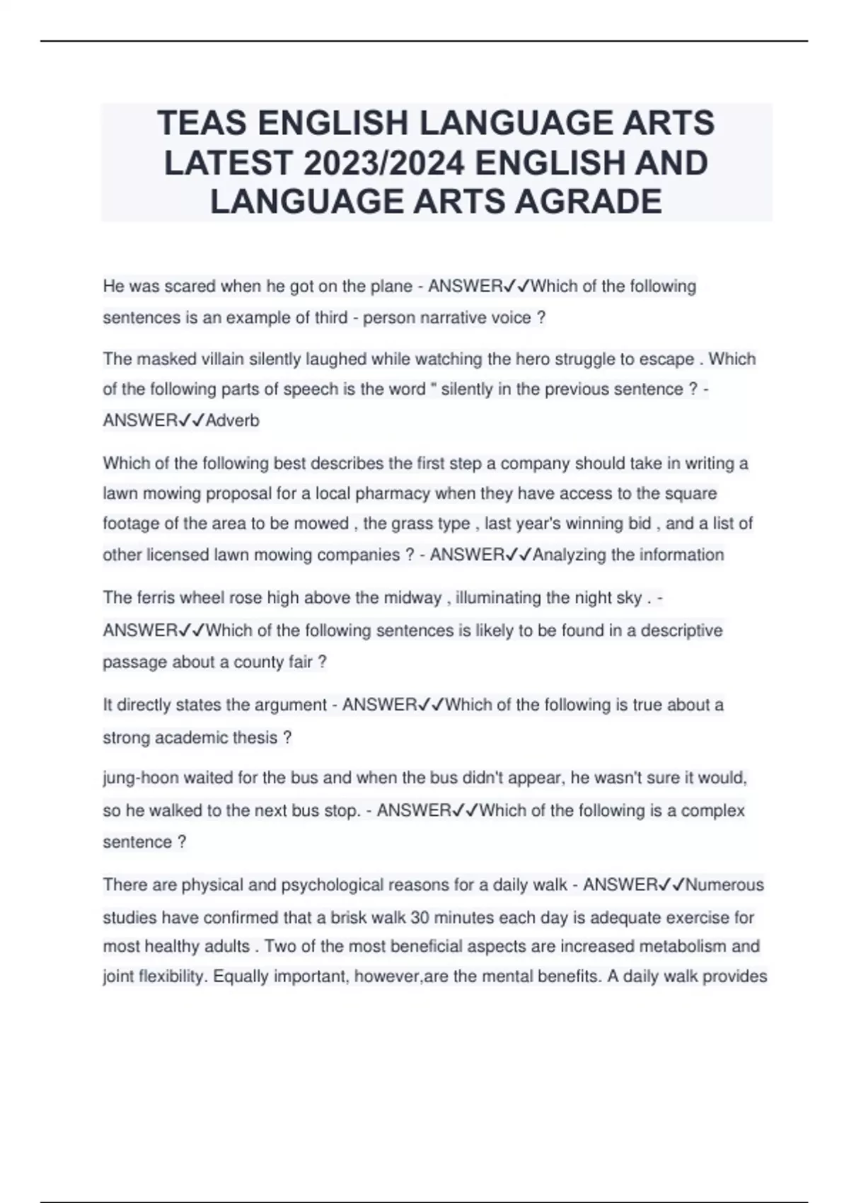 TEAS ENGLISH LANGUAGE ARTS LATEST ENGLISH AND LANGUAGE ARTS AGRADE.