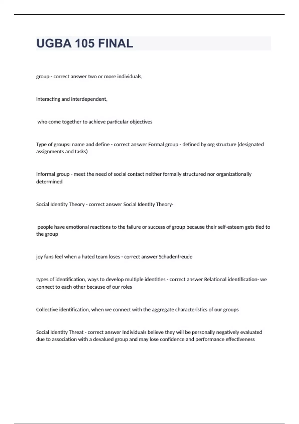 UGBA 105 FINAL Question and answers 2023/2024 verified to passgroup - correct answer two or more individuals, interacting and interdependent, who come together to achieve particular objectives Type of groups: name and define - correct answer Formal group - defined by org structure (designated assignments and tasks) Informal group - meet the need of social contact neither formally structured nor organizationally determined Social Identity Theory - correct answer Social Identity Theory- people have emotional reactions to the failure or success of group because their self-esteem gets tied to the group joy fans feel when a hated team loses - correct answer Schadenfreude types of identification, ways to develop multiple identities - correct answer Relational identification- we connect to each other because of our roles Collective identification,