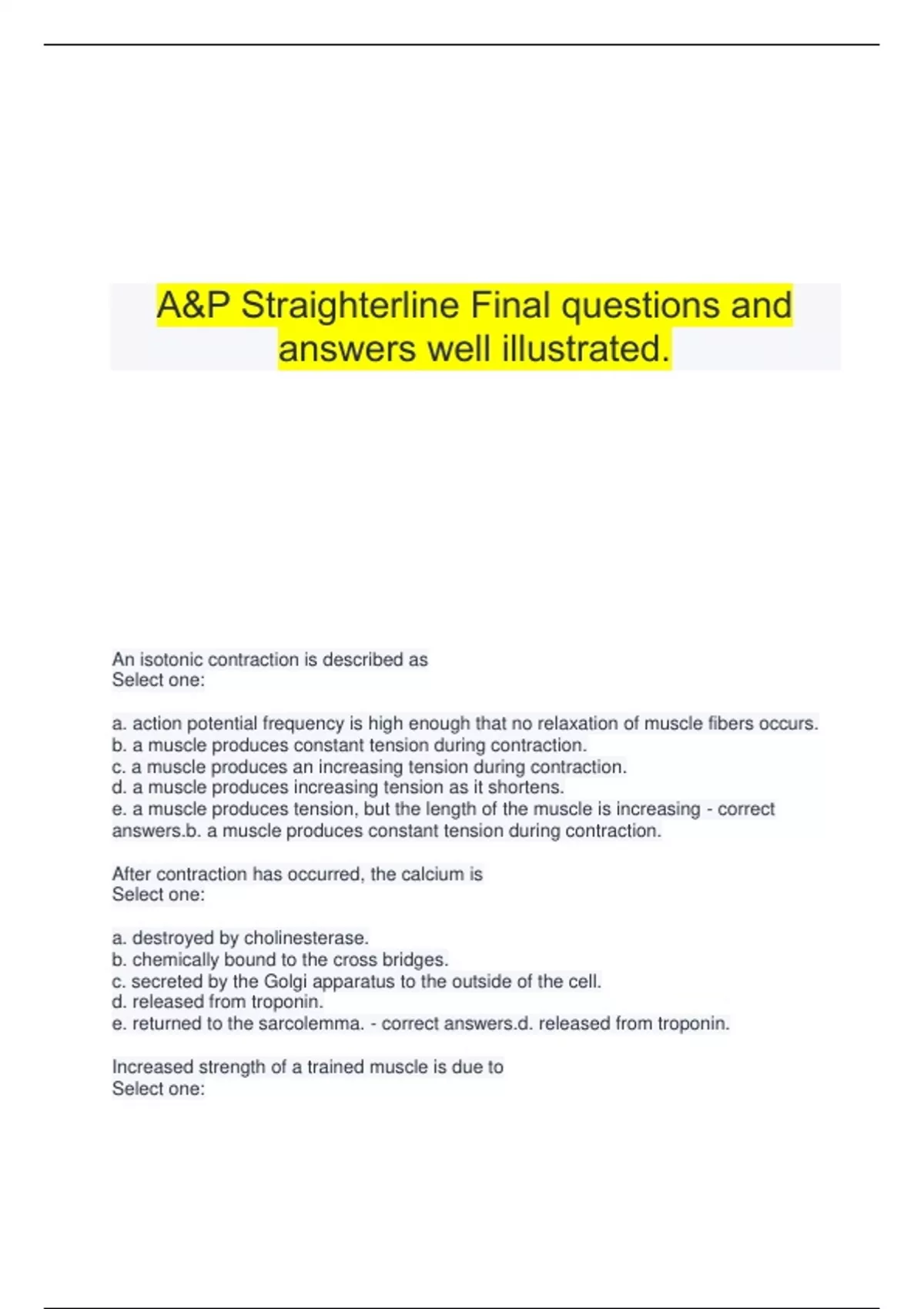 A&P Straighterline Final questions and answers well illustrated. An isotonic contraction is described as Select one: a. action potential frequency is high enough that no relaxation of muscle fibers occurs. b. a muscle produces constant tension during contraction. c. a muscle produces an increasing tension during contraction. d. a muscle produces increasing tension as it shortens. e. a muscle produces tension, but the length of the muscle is increasing - correct answers.b. a muscle produces constant tension during contraction. After contraction has occurred, the calcium is Select one: a. destroyed by cholinesterase. b. chemically bound to the cross bridges. c. secreted by the Golgi apparatus to the outside of the cell. d. released from troponin. e. returned to the sarcolemma. - correct answers.d. released from troponin. Increased strength of a trained muscle is due to Select one: a. an increased number of muscle fibers. b. the nervous system's ability to recruit a large number of motor units simultaneously. c. elimination of unnecessary enzymes and metabolic pathways. d. elimination of all fat deposits. e. elimination of unnecessary connective tissue. - correct answers.b. the nervous system's ability to recruit a large number of motor units simultaneously. Skeletal muscle fibers Select one: a. possess striations. b. can contract but are not extensible or excitable. c. do not require nerve innervation to contract. d. increase dramatically in number after birth. e. are found in the walls of the stomach. - correct answers.a. possess striations. Which of the following correctly describes myoglobin's special function in muscle tissue? Select one: a. breaks down glycogen b. synthesizes ATP c. acts as a reservoir for oxygen d. produces action potentials e. stores glucose - correct answers.c. acts as a reservoir for oxygen The outside of the resting plasma membrane is __________ relative to the inside of the resting plasma membrane. Select one: a. positively charged b. negatively charged c. electrically neutral d. recharged e. None of these choices is correct. - correct answers.a. positively charged Fascia Select one: a. surrounds individual muscles. b. separates muscle fibers. c. connects muscles to bone. d. is a type of muscle tissue. e. is a type of nerve tissue. - correct answers.a. surrounds individual muscles. When repolarization of the cell membrane is complete, the