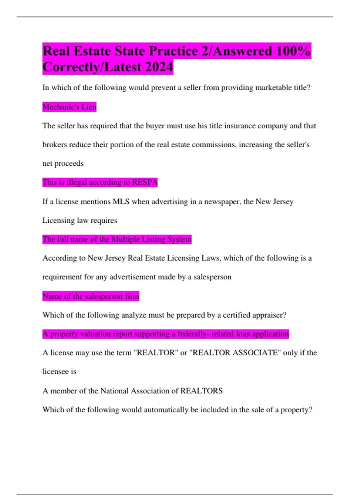 Real Estate State Practice 2/Answered 100% Correctly/Latest 2024 In which of the following would prevent a seller from providing marketable title? Mechanic's Lien The seller has required that the buyer must use his title insurance company and that brokers reduce their portion of the real estate commissions, increasing the seller's net proceeds This is illegal according to RESPA If a license mentions MLS when advertising in a newspaper, the New Jersey Licensing law requires The full name of the Multiple Listing System According to New Jersey Real Estate Licensing Laws, which of the following is a requirement for any advertisement made by a salesperson Name of the salesperson firm Which of the following analyze must be prepared by a certified appraiser? A property valuation report supporting a federally- related loan application A license may use the term "REALTOR" or "REALTOR ASSOCIATE" only if the licensee is A member of the National Association of REALTORS Which of the following would automatically be included in the sale of a property? Plumbing Fixtures A seller is offering his property for sale in as is condition. A buyer enters into a contract with the seller and has the home inspected. A latent defect is found that is known to, but not disclosed by, the seller. The buyer Can void the contract due to the seller's failure to disclose the latent defect Maintains a real estate agency and terminated two salespersons in this situation, the broker is REQUIRED to take all the following steps EXCEPT Permit them to remove original sales and listing contracts from the broker's office What should buyers insert into the purchase offer to make sure they would NOT have to go through with the purchase if they are not met? Contingencies A potential buyer signs a contract with a seller but then decides not to buy. The seller may sue potential buyer for specific performance because the contract was Bilateral Contract Standard title insurance policy would protect a buyer When the seller has forged his ex-wife signature on the deed Under New Jersey Real Estate Commission rules, a licensee's obligations to the public include all of the following EXCEPT Accepting any reasonable commission offered by a seller in the course of