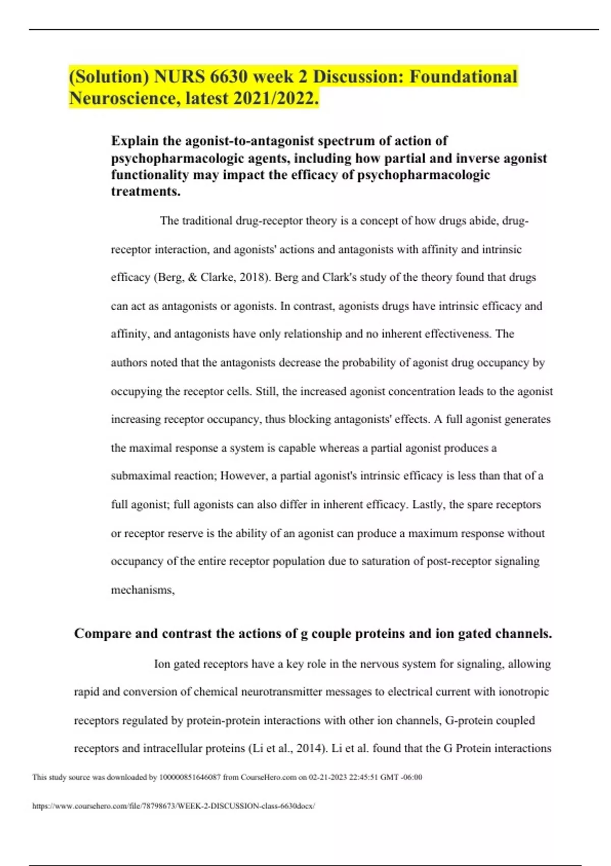 (Solution) NURS 6630 week 2 Discussion: Foundational Neuroscience, latest 2021/2022. Explain the agonist-to-antagonist spectrum of action of psychopharmacologic agents, including how partial and inverse agonist functionality may impact the efficacy of psychopharmacologic treatments. The traditional drug-receptor theory is a concept of how drugs abide, drug- receptor interaction, and agonists' actions and antagonists with affinity and intrinsic efficacy (Berg, & Clarke, 2018). Berg and Clark's study of the theory found that drugs can act as antagonists or agonists. In contrast, agonists drugs have intrinsic efficacy and affinity, and antagonists have only relationship and no inherent effectiveness. The authors noted that the antagonists decrease the probability of agonist drug occupancy by occupying the receptor cells. Still, the increased agonist concentration leads to the agonist increasing receptor occupancy, thus blocking antagonists' effects. A full agonist generates the maximal response a system is capable whereas a partial agonist produces a submaximal reaction; However, a partial agonist's intrinsic efficacy is less than that of a full agonist; full agonists can also differ in inherent efficacy. Lastly, the spare receptors or receptor reserve is the ability of an agonist can produce a maximum response without occupancy of the entire receptor population due to saturation of post-receptor signaling mechanisms, Compare and contrast the actions of g couple proteins and ion gated channels. Ion gated receptors have a key role in the nervous system for signaling, allowing rapid and conversion of chemical neurotransmitter messages to electrical current with ionotropic receptors regulated by protein-protein interactions with other ion channels, G-protein coupled receptors and intracellular proteins (Li et al., 2014). Li et al. found that the G Protein interactions with ion channel receptors can increase the capacity of neuronal signaling cascades and represent
