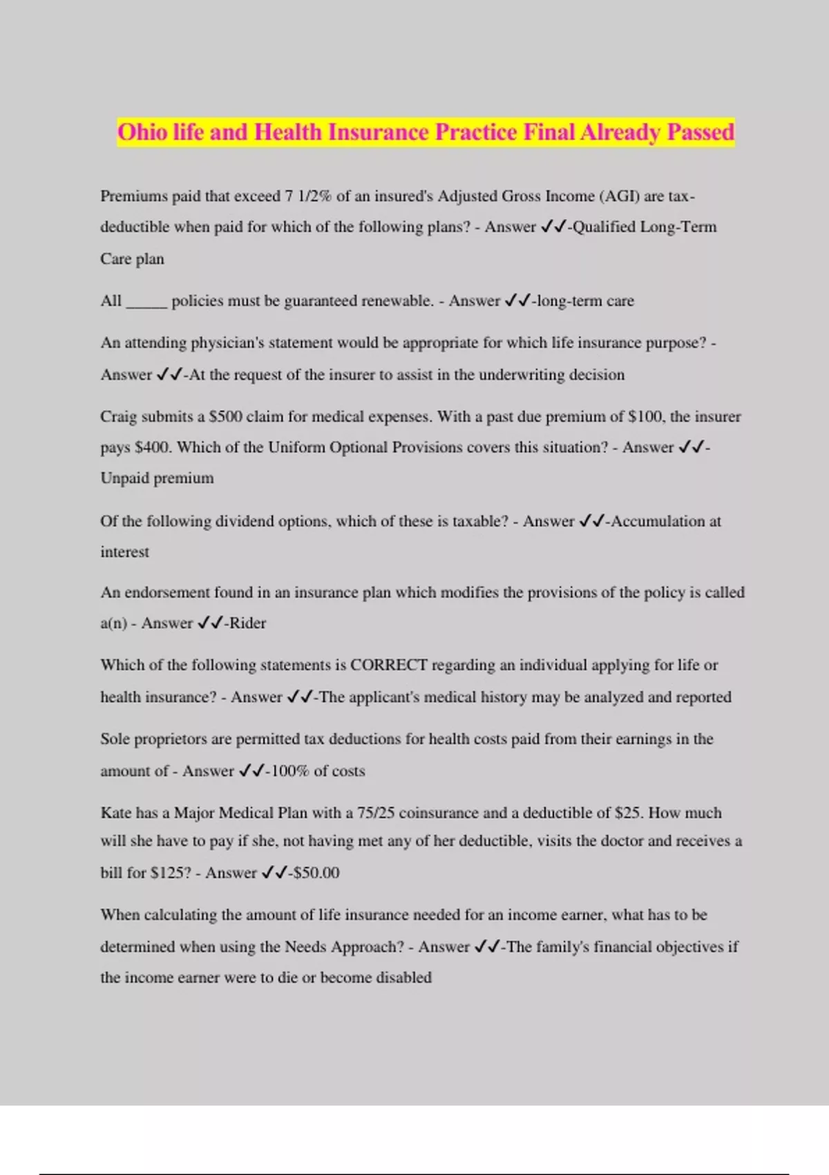 Ohio life and Health Insurance Practice Final Already Passed Premiums paid that exceed 7 1/2% of an insured's Adjusted Gross Income (AGI) are tax- deductible when paid for which of the following plans? - Answer ️️ -Qualified Long-Term Care plan All _____ policies must be guaranteed renewable. - Answer ️️ -long-term care An attending physician's statement would be appropriate for which life insurance purpose? - Answer ️️ -At the request of the insurer to assist in the underwriting decision Craig submits a $500 claim for medical expenses. With a past due premium of $100, the insurer pays $400. Which of the Uniform Optional Provisions covers this situation? - Answer ️️ - Unpaid premium Of the following dividend options, which of these is taxable? - Answer ️️ -Accumulation at interest An endorsement found in an insurance plan which modifies the provisions of the policy is called a(n) - Answer ️️ -Rider Which of the following statements is CORRECT regarding an individual applying for life or health insurance? - Answer ️️ -The applicant's medical history may be analyzed and reported Sole proprietors are permitted tax deductions for health costs paid from their earnings in the amount of - Answer ️️ -100% of costs Kate has a Major Medical Plan with a 75/25 coinsurance and a deductible of $25. How much will she have to pay if she, not having met any of her deductible, visits the doctor and receives a bill for $125? - Answer ️️ -$50.00 When calculating the amount of life insurance needed for an income earner, what has to be determined when using the Needs Approach? - Answer ️️ -The family's financial objectives if the income earner were to die or become disabled A plan in which an employer pays insurance benefits from a fund derived from the employer's current revenues is called - Answer ️️ -A self-funded plan If an insured's age on a life insurance policy has been misstated, what is the insurer's liability if the insured dies? - Answer ️️ -A prorated death benefit based on the amount of insurance the insured's premiums would have been if purchased at the correct age Which of the following is permitted in an advertisement for an insurance policy? - Answer ️️ - The insurer's name Which type of rider will waive the premium on a child's life insurance policy if the parent paying the premium dies? - Answer ️️ -Payor benefit A type of insurer that is owned by its policyowners is called - Answer ️️ -mutual An annuitant dies during the distribution period. What kind of annuity will return to a beneficiary the difference between the annuity value and the income payments already made? - Answer ️️ - Refund annuity A form of medical health insurance covering the treatment and care of gum disease is called - Answer ️️ -Dental expense ins