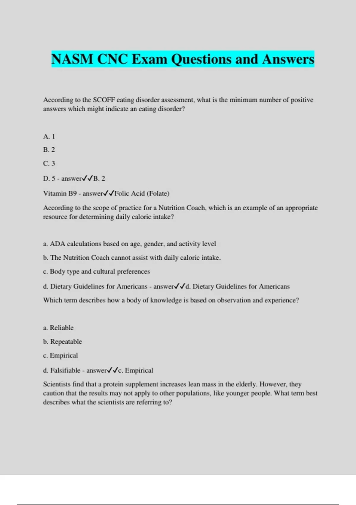 NASM CNC Exam Questions and Answers According to the SCOFF eating disorder assessment, what is the minimum number of positive answers which might indicate an eating disorder? A. 1 B. 2 C. 3 D. 5 - answerB. 2 Vitamin B9 - answerFolic Acid (Folate) According to the scope of practice for a Nutrition Coach, which is an example of an appropriate resource for determining daily caloric intake? a. ADA calculations based on age, gender, and activity level b. The Nutrition Coach cannot assist with daily caloric intake. c. Body type and cultural preferences d. Dietary Guidelines for Americans - answerd. Dietary Guidelines for Americans Which term describes how a body of knowledge is based on observation and experience? a. Reliable b. Repeatable c. Empirical d. Falsifiable - answerc. Empirical Scientists find that a protein supplement increases lean mass in the elderly. However, they caution that the results may not apply to other populations, like younger people. What term best describes what the scientists are referring to? a. Reliability b. External validity c. Test-retest reliability d. Selection bias - answerb. External validity Scientists gather 20 studies looking at the relationship between protein intake and lean body mass, and then they statistically analyze them together as a group. What type of study is this? a. Narrative review b. Meta-analysis c. Randomized controlled trials d. Observational research - answerb. Meta-analysi