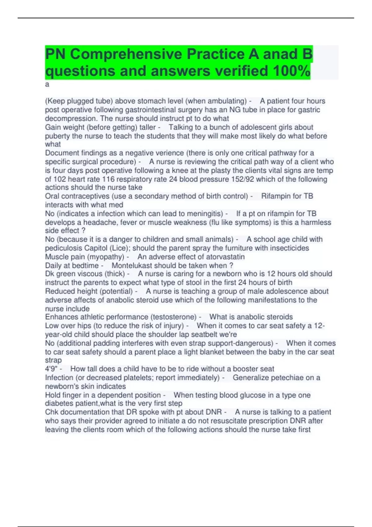 PN Comprehensive Practice A anad B questions and answers verified 100% a (Keep plugged tube) above stomach level (when ambulating) - A patient four hours post operative following gastrointestinal surgery has an NG tube in place for gastric decompression. The nurse should instruct pt to do what Gain weight (before getting) taller - Talking to a bunch of adolescent girls about puberty the nurse to teach the students that they will make most likely do what before what Document findings as a negative verience (there is only one critical pathway for a specific surgical procedure) - A nurse is reviewing the critical path way of a client who is four days post operative following a knee at the plasty the clients vital signs are temp of 102 heart rate 116 respiratory rate 24 blood pressure 152/92 which of the following actions should the nurse take Oral contraceptives (use a secondary method of birth control) - Rifampin for TB interacts with what med No (indicates a infection which can lead to meningitis) - If a pt on rifampin for TB develops a headache, fever or muscle weakness (flu like symptoms) is this a harmless side effect ? No (because it is a danger to children and small animals) - A school age child with pediculosis Capitol (Lice); should the parent spray the furniture with insecticides Muscle pain (myopathy) - An adverse effect of atorvastatin Daily at bedtime - Montelukast should be taken when ? Dk green viscous (thick) - A nurse is caring for a newborn who is 12 hours old should instruct the parents to expect what type of stool in the first 24 hours of birth Reduced height (potential) - A nurse is teaching a group of male adolescence about adverse affects of anabolic steroid use which of the following manifestations to the nurse include Enhances athletic performance (testosterone) - What is anabolic steroids Low over hips (to reduce the risk of injury) - When it comes to car seat safety a 12- year-old child should place the shoulder lap seatbelt we're No (additional padding interferes with even strap support-dangerous) - When it comes to car seat safety should a parent place a light blanket between the baby in the car seat strap 4'9" - How tall does a child have to be to ride without a booster seat Infection (or decreased platelets; report immediately) - Generalize petechiae on a newborn's skin indicates Hold finger in a dependent position - When testing blood glucose in a type one diabetes patient,what is the very first step Chk documentation that DR spoke with pt about DNR - A nurse is talking to a patient who says their provider agreed to initiate a do not resuscitate prescription DNR after leaving the clients room which of the following actions should the nurse take first No (dose not need to be given on an empty stomach) - A nurse is preparing to administer a dose of digoxin to a patient who is receiving continuous tube feeding should the nurse stop the tube feeding 30 minutes prior to administering the medication Flush feeding tube (before and after/30mL) - When administering digoxin to a patient who is receiving continuous tube feedings which of the following should the nurse do Level of activity (also facial, consolability) - When used in a FLACC scale to determine the level of pain for a 11 month old infant who is post operative which of the following factors to the nurse considered when using the pain scale Hydration status - A nurse in a long-term care facility is documenting care of an older patient which of the following information should the nurse include in the weekly summary side lying (the elevate head of bed) - A patient that his postoperative wants to sit on the side of the bed what is the first step the nurse should take ? Place pt in what position? Pt gets outPN comprehensive online practice 2020 B questions and answers A nurse is assisting with monitoring a client who is in labor and has spontaneous rupture of membranes following a vaginal examination. The provider reports the client's cervix is dilated to 1 cm with an unengaged presenting part. Which of the following actions should the nurse take? - Apply the external fetal heart rate monitor. A Nurse is collecting data from a client who has bipolar disorder and is experiencing acute mania. Which of the following findings is the nurse's priority? - lack of sleep A nurse is reinforcing teaching with a client who has a type 2 diabetes mellitus and reports waking during the night with tremors and anxiety. which of the following information should the nurse provide to help the client manage his symptoms? - Eat a bedtime snack a Nurse is reinforcing teaching for a client who has a coronary artery disease and is taking lowdose aspirin daily. The nurse should include that this medication has which of the following therapeutic effects for CAD? - Antiplatelet A nurse is collecting data from a client who has an unprepared femur fracture and rates his pain as 8 on a scale of 0 to 10. The client is talking and caught with a visitor. Which of the following of the prescribed medication should the nurse administer? - Hydromorphone 5 mg orally. A nurse is reinforcing preoperative teaching with a client scheduled for a bowel retention with ileostomy. which of the following descriptions should the nurse give of the expected output from a mature ileostomy? - liquid with little odor A nurse is caring for a client who is 16 hr postoperative following a total hip arthroplasty. the client reports numbness, pain, and tingling in the affected leg. Which of the following actions should the nurse take first? - compare capillary refill in toes bilateraly A nurse is reinforcing teaching with a client who has acute diverticulitis. Which of the following statements by the client indicates an understanding of the teaching about the acute phase of diverticulitis? - "I will receive the nutrient I need through my IV Fluid" A nurse in reinforcing teaching with a client about cancer prevention. The nurse should include that frequent consumption of