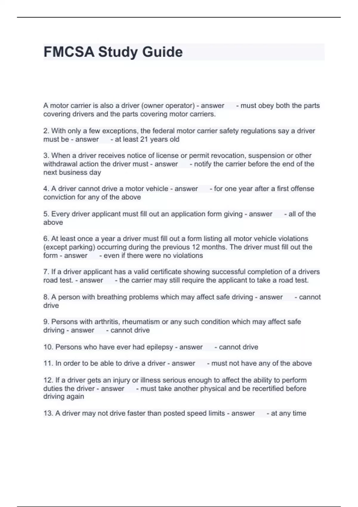 Exam of 4 pages for the course FMCSA at FMCSA (FMCSA Study Guide)