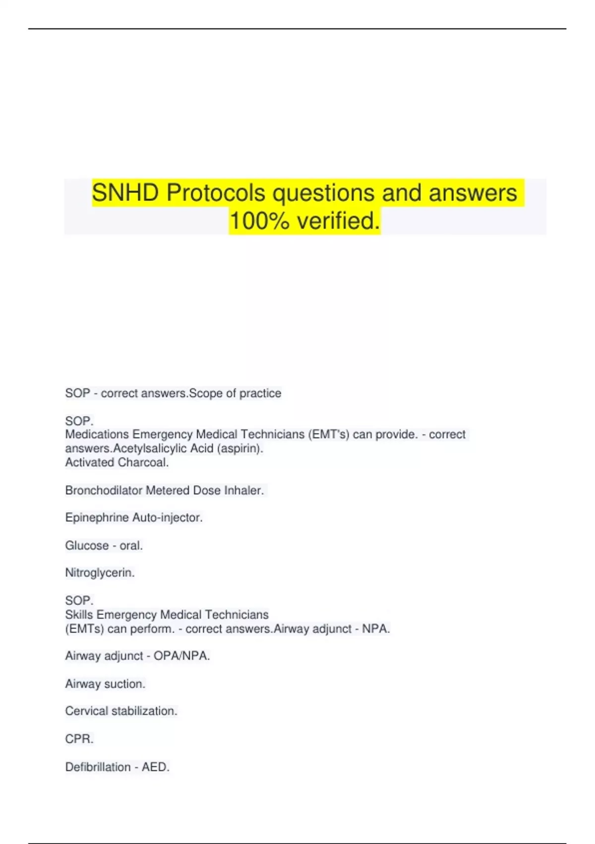 SNHD Protocols questions and answers 100% verified. SOP - correct answers.Scope of practice SOP. Medications Emergency Medical Technicians (EMT's) can provide. - correct answers.Acetylsalicylic Acid (aspirin). Activated Charcoal. Bronchodilator Metered Dose Inhaler. Epinephrine Auto-injector. Glucose - oral. Nitroglycerin. SOP. Skills Emergency Medical Technicians (EMTs) can perform. - correct answers.Airway adjunct - NPA. Airway adjunct - OPA/NPA. Airway suction. Cervical stabilization. CPR. Defibrillation - AED. Glucose measurement. Medication administration. Oxygen administration. Patient assessment. Pulse Oximetry. Restraints. Splinting. Stroke screen. Thermometer. Formulary. Acetylsalicylic Acid (Aspirin). - correct answers.Class. Non steroidal anti-inflammatory. Action. Platelet inhibition. Dose. Adult. 324 mg PO (81 mg tablets x 4). Pediatric. Not recommended for use. Route. PO. (chew and swallow) Contraindications. Allergy to aspirin. Adverse reactions. none. Formulary. Activated charcoal - correct answers.Class. Absorbent. Action. Inhibits gastrointestinal absorption of toxic substances. Dose. Adult. 50 gm PO Pediatric. 1.0 gm/kg PO; dose 10 gm max. Dose 50 gm. Formulary. Activated charcoal. Continued - correct answers.Contraindications. Altered mental status; ingestion of acids, Alkalis or petroleum distillates; inability to swallow; previous administration of an emetic. Adverse reactions. Nausea; vomiting Formulary. Bronchodilator Metered Dose Inhaler. - correct answers.Class. Sympathomimetic. Action. Bronchodilator. Dose. Adult. Assist patient in administering his or her own bronchodilator metered dose inhaler exactly as prescribed. (Pediatric. Same as adult) Formulary. Bronchodilator Metered Dose Inhaler. Continued - correct answers.Route. Inhalation. Contraindications. Hypersensitivity to the drug. Adverse reactions. tachycardia; palpitations; anxiousness; headache EPINEPHRINE AUTO-INJECTOR - correct answers.CLASS. Sympathomimetic. ACTION. Bronchodilation; positive chronotrope; positive inotrope. DOSE. Adult. Assist patient with his or her own Epinephrine auto-injector. (Pediatric same as adult) ROUTE. IM. Formulary. EPINEPHRINE AUTO-INJECTOR.