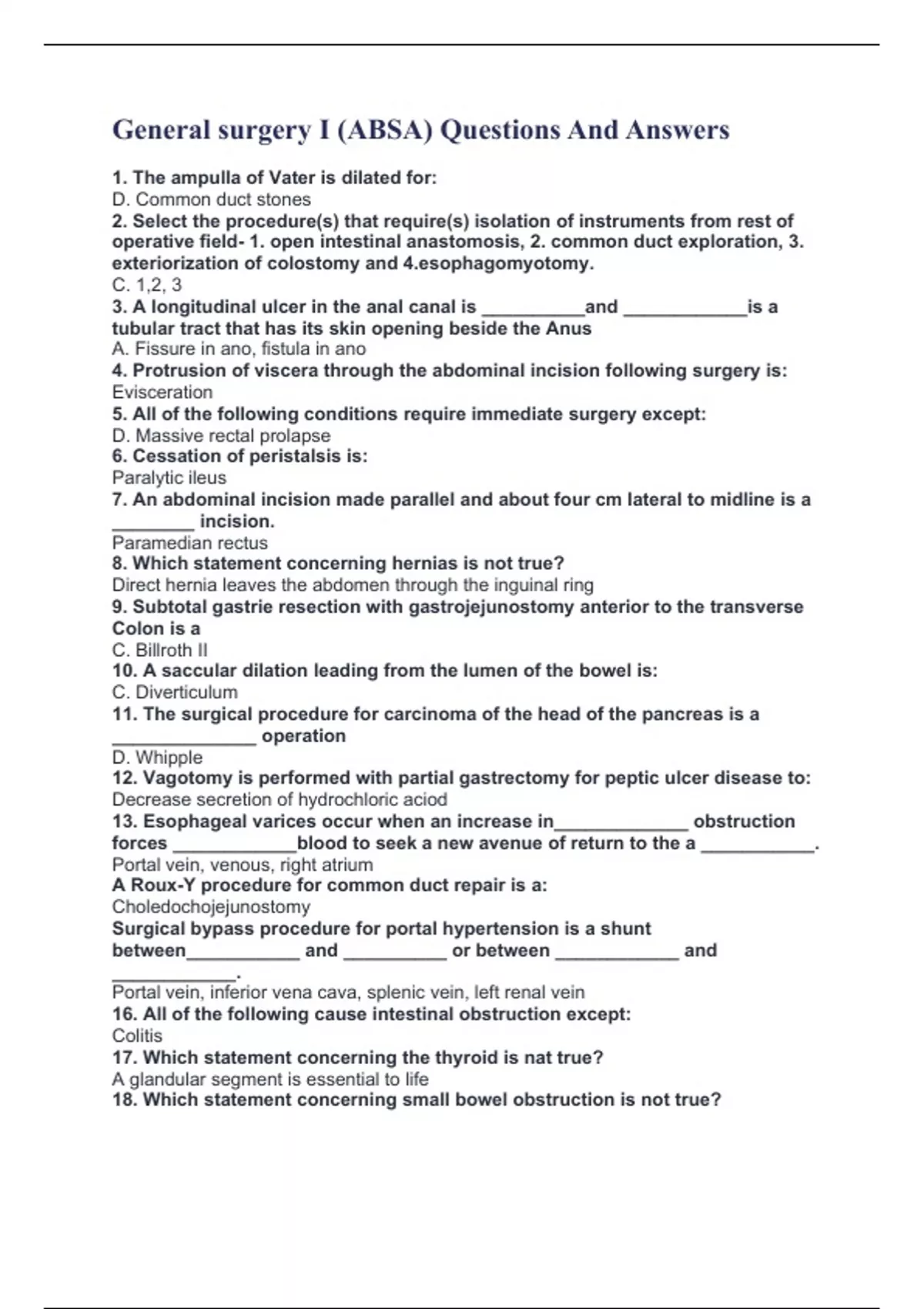 General surgery I (ABSA) Questions And Answers 1. The ampulla of Vater is dilated for: D. Common duct stones 2. Select the procedure(s) that require(s) isolation of instruments from rest of operative field- 1. open intestinal anastomosis, 2. common duct exploration, 3. exteriorization of colostomy and agomyotomy. C. 1,2, 3 3. A longitudinal ulcer in the anal canal is __________and ____________is a tubular tract that has its skin opening beside the Anus A. Fissure in ano, fistula in ano 4. Protrusion of viscera through the abdominal incision following surgery is: Evisceration 5. All of the following conditions require immediate surgery except: D. Massive rectal prolapse 6. Cessation of peristalsis is: Paralytic ileus 7. An abdominal incision made parallel and about four cm lateral to midline is a ________ incision. Paramedian rectus 8. Which statement concerning hernias is not true? Direct hernia leaves the abdomen through the inguinal ring 9. Subtotal gastrie resection with gastrojejunostomy anterior to the transverse Colon is a C. Billroth II 10. A saccular dilation leading from the lumen of the bowel is: C. Diverticulum 11. The surgical procedure for carcinoma of the head of the pancreas is a ______________ operation D. Whipple 12. Vagotomy is performed with partial gastrectomy for peptic ulcer disease to: Decrease secretion of hydrochloric aciod 13. Esophageal varices occur when an increase in_____________ obstruction forces ____________blood to seek a new avenue of return to the a ___________. Portal vein, venous, right atrium A Roux-Y procedure for common duct repair is a: Choledochojejunostomy Surgical bypass procedure for portal hypertension is a shunt between___________ and __________ or between ____________ and ____________. Portal vein, inferior vena cava, splenic vein, left renal vein 16. All of the following cause intestinal obstruction except: Colitis 17. Which statement concerning the thyroid is nat true? A glandular segment is essential to life 18. Which statement concerning small bowel obstruction is not true?