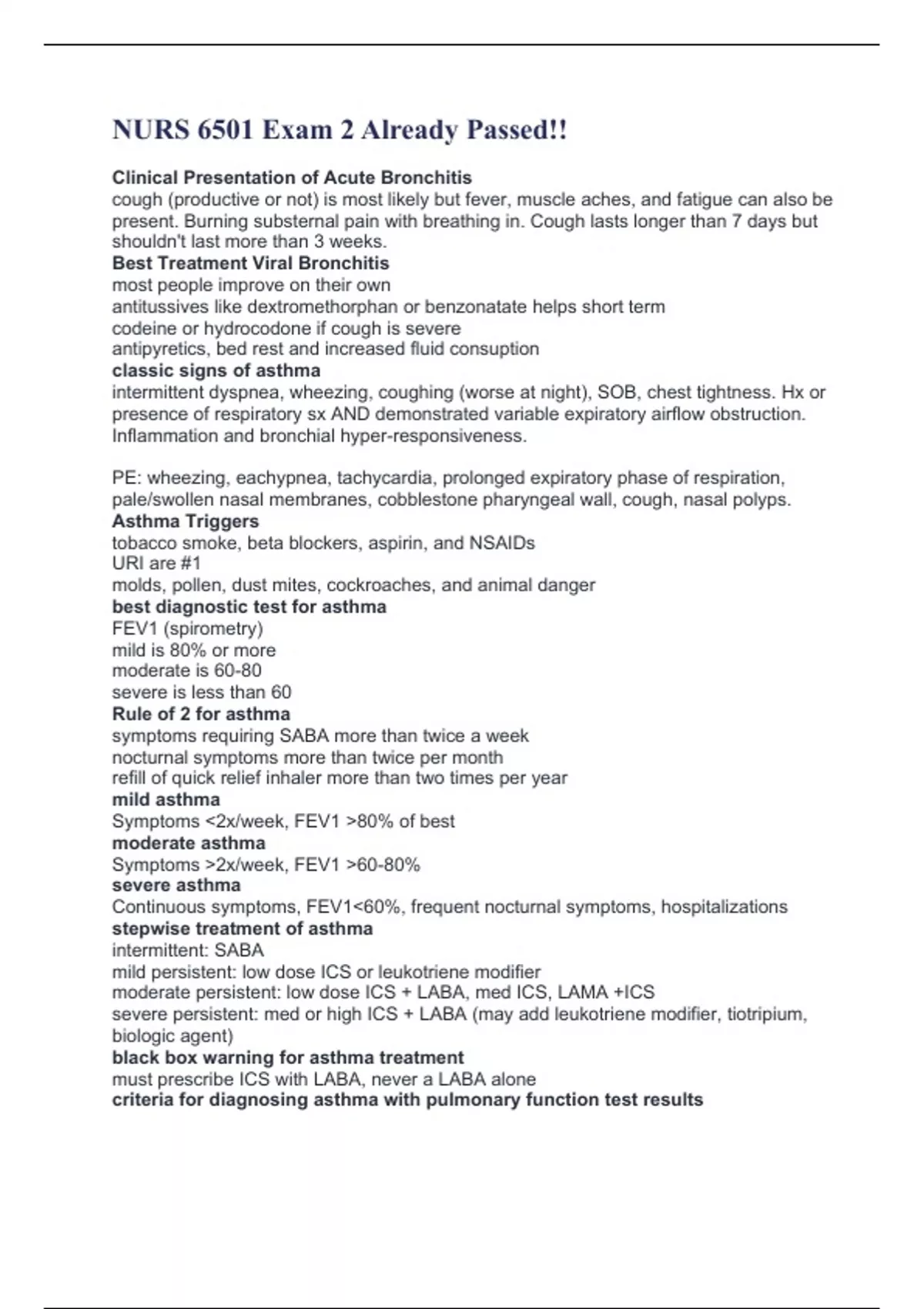 NURS 6501 Exam 2 Already Passed!! Clinical Presentation of Acute Bronchitis cough (productive or not) is most likely but fever, muscle aches, and fatigue can also be present. Burning substernal pain with breathing in. Cough lasts longer than 7 days but shouldn't last more than 3 weeks. Best Treatment Viral Bronchitis most people improve on their own antitussives like dextromethorphan or benzonatate helps short term codeine or hydrocodone if cough is severe antipyretics, bed rest and increased fluid consuption classic signs of asthma intermittent dyspnea, wheezing, coughing (worse at night), SOB, chest tightness. Hx or presence of respiratory sx AND demonstrated variable expiratory airflow obstruction. Inflammation and bronchial hyper-responsiveness. PE: wheezing, eachypnea, tachycardia, prolonged expiratory phase of respiration, pale/swollen nasal membranes, cobblestone pharyngeal wall, cough, nasal polyps. Asthma Triggers tobacco smoke, beta blockers, aspirin, and NSAIDs URI are #1 molds, pollen, dust mites, cockroaches, and animal danger best diagnostic test for asthma FEV1 (spirometry) mild is 80% or more moderate is 60-80 severe is less than 60 Rule of 2 for asthma symptoms requiring SABA more than twice a week nocturnal symptoms more than twice per month refill of quick relief inhaler more than two times per year mild asthma Symptoms 2x/week, FEV1 80% of best moderate asthma Symptoms 2x/week, FEV1 60-80% severe asthma Continuous symptoms, FEV160%, frequent nocturnal symptoms, hospitalizations stepwise treatment of asthma intermittent: SABA mild persistent: low dose ICS or leukotriene modifier moderate persistent: low dose ICS + LABA, med ICS, LAMA +ICS severe persistent: med or high ICS + LABA (may add leukotriene modifier, tiotripium, biologic agent) black box warning for asthma treatment must prescribe ICS with LABA, never a LABA alone criteria for diagnosing asthma with pulmonary function test results variability testing before and after bronchodilator, from one office visit to another or before after bronchoprovocation challenge. Increase FEV of 12% or more, accompanied by an absolute increase in FEV1 of at least 200 mL hemoptysis coughing up blood hematemesis vomiting blood epistaxis nosebleed pleural effusion abnormal amount of fluid within the pleural space. The pleura is a serous membrane covering the lung parenchyma, mediastinum, diaphragm and rib cage. Two pleural membranes: parietal (lines chest cavity) and visceral (covers both lungs). Occurs when fluid formation exceeds fluid absorption. CHF is one of most common causes. pleural effusion symptoms dyspnea, nonproductive cough, pleuritic chest pain and activity intolerance. Dyspnea worsens with recumbent positions, cough worsens as size of effusion increases. Pleuritic pain is sharp, unilateral and localized to affected area, exacerbated by deep inspiration cough or movement of upper body. first line of treatment fo community acquire pneumonia for healthy adult a macrolide is first line (Azithromycin, Erythromycin); doxycycline if pt unable to take macrolide. first line of treatment of community acquired pneumonia for individuals with comorbidities fluoroquinolone or a beta lactam plus a macrolide antibiotic is recommended. first line of treatment of community acquired pneumonia for pts in ICU a beta lactam (ceftriaxone, cefotaxime or ampicillin-sulbactam) plus either azithromycin and fluoroquinolone (levofloxacin etc). bacterial community acquired pneumonia gram positive bacteria S. pneumoniae, common in individuals with comorbidities like diabetes, COPD, asplenia, advanced age, cigarette smoking, congestive heart failure, dementia, alcoholism or immunosuppression abrupt onset of high fever with chills, productive cough with purulent sputum and signs of consolidation like egophony, increased fremitus, dullness to percussion, rales and rhonchi. . bacterial community acquired pneumonia gram negative bacteria H. influenzae, typically caused by an encapsulated strain. older adults and those with underlying lung conditions are most susceptible to bacterium. Abrupt onset of fever, shaking chills, cough with purulent sputum. older adults presentation of pneumonia lethargy, lack of appetite, increased falls and mental status changes pneumonia presentation fever, chills, malaise, cough with or without sputum production. Rales that do not clear with a cough, bronchial breath sounds, egophony. Younger individuals (48) typically exhibit fever. Older adults have lethargy, lack of appetite, increased falls and mental status changes. CXR shows consolidation. influenza presentation abrupt onset of symptoms fever, myalgias, headache, sore throat, dry cough, rhinitis, nasal congestion, fatigue, chills. Temperature rises fast and decreases by the 2nd or third day. Symptoms last 1-2 weeks, cough can last up to 2 weeks treatment of influenza early treatment with oseltamivir and zanamivir (contraindicated in asthma or chronic lung disease d/t SE of bronchospasm) is recommended for those at high risk to prevent influenza pneumonia (treat if they present 48 hrs from onset of symptoms, also treat healthcare providers that care for patients who are high risk. Can also use peramivir IV x1 dose. Otherwise, rest, fluid intake, antipyretics and NSAIDs. D dimer test screen whether or not a clot has just been dissolved by fibrinolysis (part of a fibrin protein), CT angiogram to diagnose a PE. D dimers have a good negative predictive value but poor positive predictive value of PE. D dimer is not helpful postoperatively, trauma, hospitalization or in critically ill patients as coagulation and fibrolysis is high. HTN meds for African Americans thiazides (chlorothiazide, hydrochlorothiazide) and calcium channel blockers (amlodipine, diltiazem, nicardipine) HTN meds for Asian Americans Calcium channel blockers and ACE inhibitors four patient groups that meet indications for starting statin therapy All diabetics (40-75 years old) All with elevated LDL (190) 