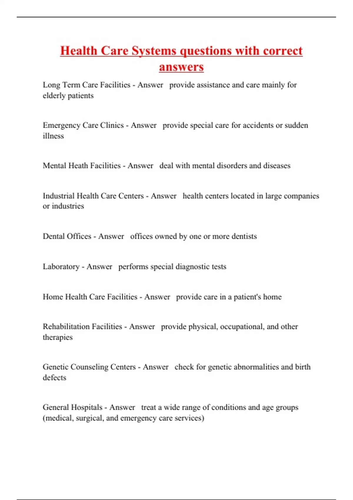 health care systems questions with correct answers