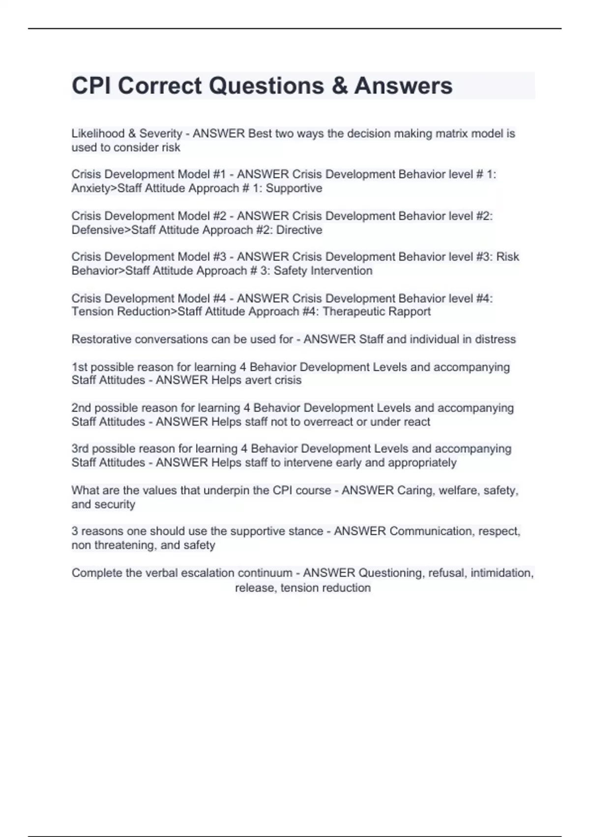 Likelihood & Severity - ANSWER Best two ways the decision making matrix model is used to consider risk Crisis Development Model #1 - ANSWER Crisis Development Behavior level # 1: AnxietyStaff Attitude Approach # 1: Supportive Crisis Development Model #2 - ANSWER Crisis Development Behavior level #2: DefensiveStaff Attitude Approach #2: Directive Crisis Development Model #3 - ANSWER Crisis Development Behavior level #3: Risk BehaviorStaff Attitude Approach # 3: Safety Intervention Crisis Development Model #4 - ANSWER Crisis Development Behavior level #4: Tension ReductionStaff Attitude Approach #4: Therapeutic