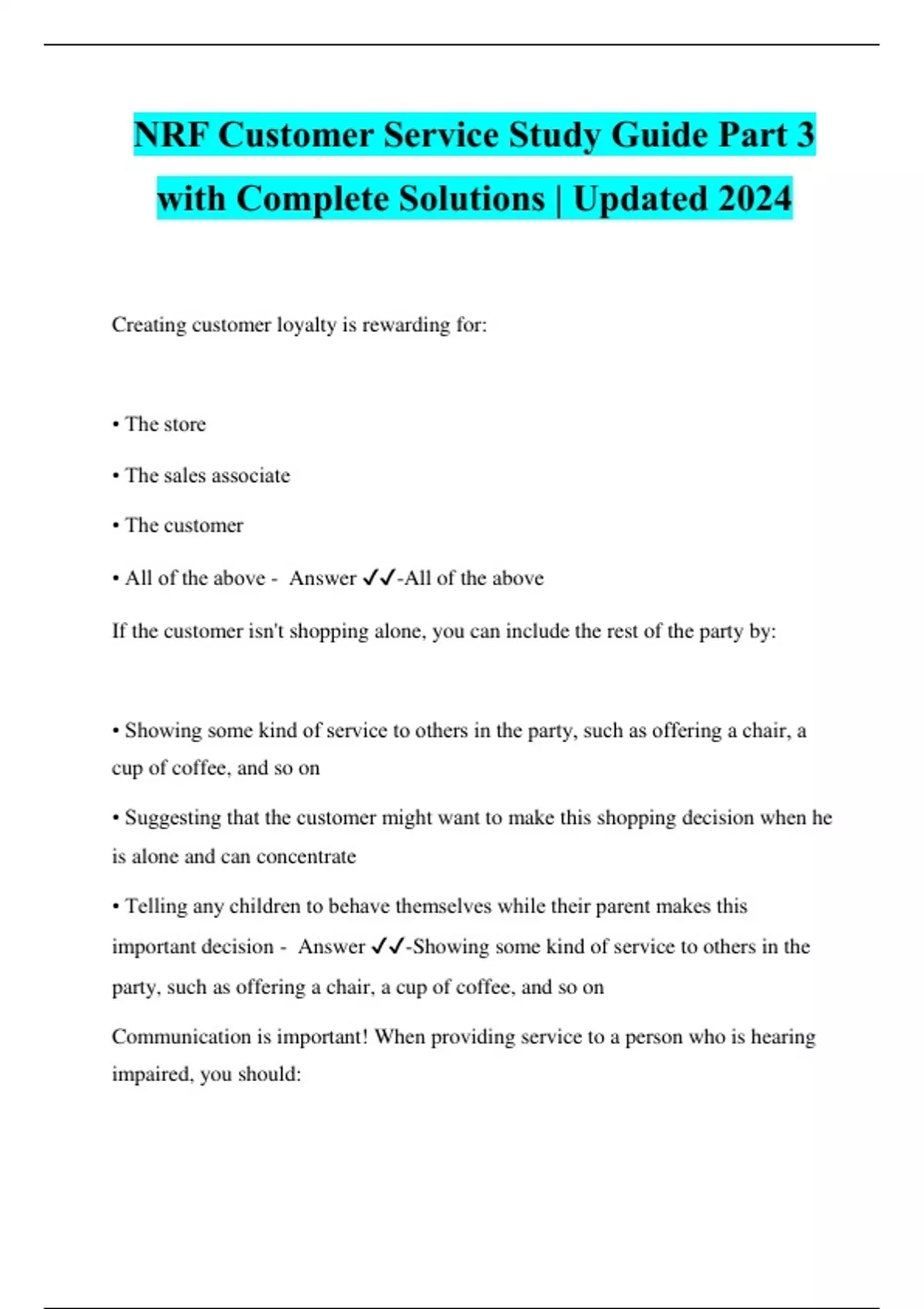 NRF Customer Service Study Guide Part 3 with Complete Solutions | Updated 2024