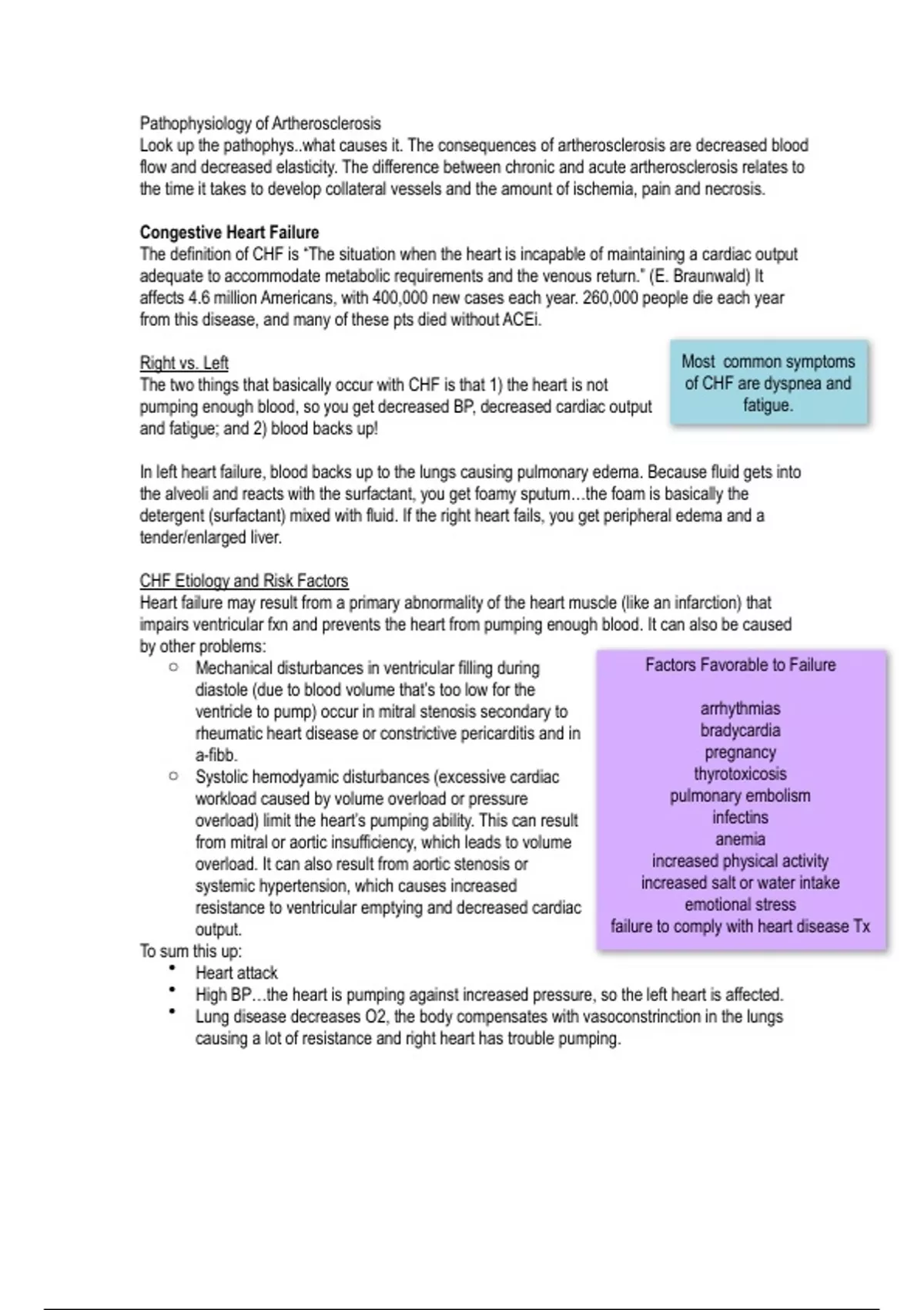 Pathophysiology of Artherosclerosis Look up the pathophys..what causes it. The consequences of artherosclerosis are decreased blood flow and decreased elasticity. The difference between chronic and acute artherosclerosis relates to the time it takes to develop collateral vessels and the amount of ischemia, pain and necrosis. Congestive Heart Failure The definition of CHF is “The situation when the heart is incapable of maintaining a cardiac output adequate to accommodate metabolic requirements and the venous return.” (E. Braunwald) It affects 4.6 million Americans, with 400,000 new cases each year. 260,000 people die each year from this disease, and many of these pts died without ACEi. Right vs. Left The two things that basically occur with CHF is that 1) the heart is not pumping enough blood, so you get decreased BP, decreased cardiac output and fatigue; and 2) blood backs up! In left heart failure, blood backs up to the lungs causing pulmonary edema. Because fluid gets into the alveoli and reacts with the surfactant, you get foamy sputum…the foam is basically the detergent (surfactant) mixed with fluid. If the right heart fails, you get peripheral edema and a tender/enlarged liver.