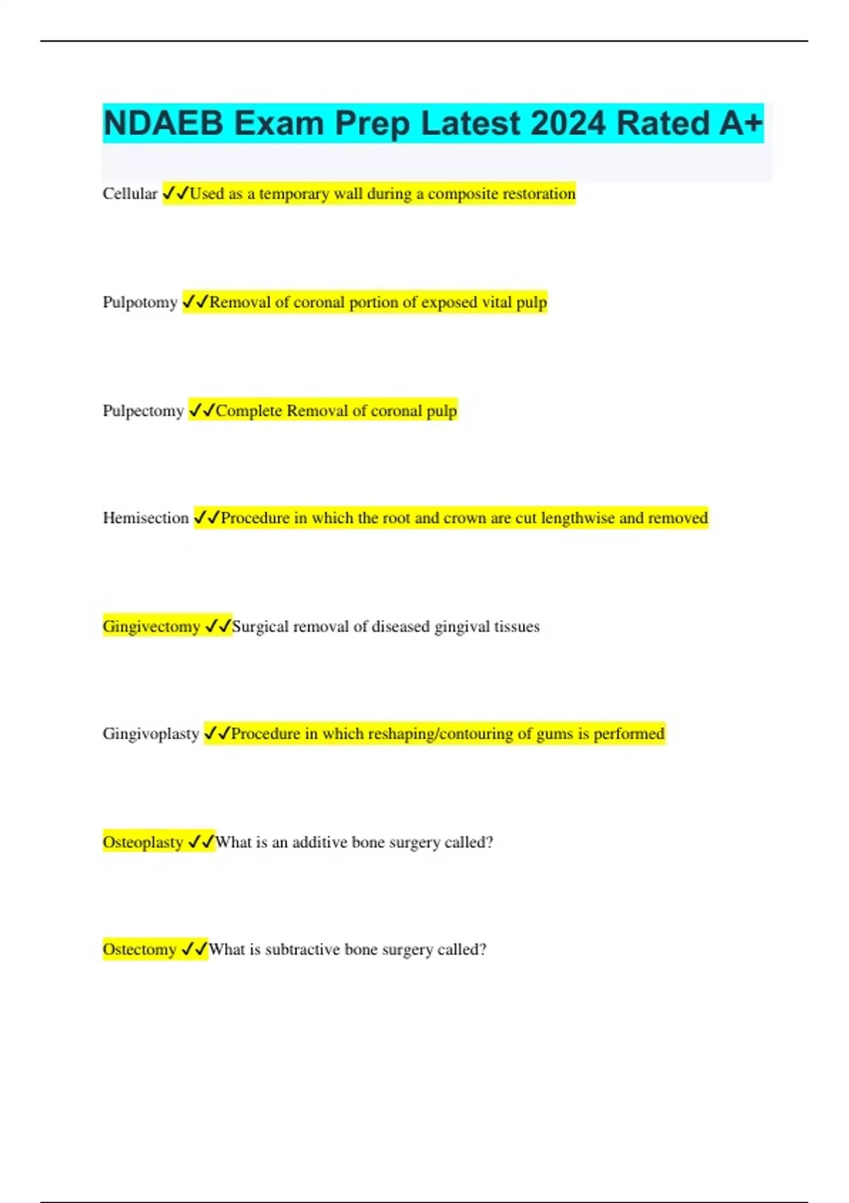 NDAEB Exam Prep Latest 2024 Rated A+ Cellular Used as a temporary wall during a composite restoration Pulpotomy Removal of coronal portion of exposed vital pulp Pulpectomy Complete Removal of coronal pulp Hemisection Procedure in which the root and crown are cut lengthwise and removed Gingivectomy Surgical removal of diseased gingival tissues Gingivoplasty Procedure in which reshaping/contouring of gums is performed Osteoplasty What is an additive bone surgery called? Ostectomy What is subtractive bone surgery called? Irreversible A form of pulpitis that can not be healed Periodontal abscess inflammatory reaction most commonly caused by bacteria trapped in the periodontal sulcus Pulp Fibrosis When there is a decrease of living cells within the tissue, fibrous tissue will take over the pulpal canal. Root Tip Picks Surgical instrument used in the removal of root tips or fragments Bone File Instrument used to smooth bone Mouth Prop Used to hold mouth open during procedures and allows for better client comfort Excisional Biopsy Surgical procedure involving removal of an entire lesion plus some normal tissue Inner Knob Used to increase or decrease the size of the matrix band loop Indications for Endo Fractured tooth Neurotic Pulp Tooth can be restored to natural function Contraindications for Endo Tooth not able to be restored to natural function Can not be maintained periodontally What are the 3 diagnostic tests done by the dentist to determine vitality of tooth? Percussion/Palpatation Thermal Sensitivity Electric Pulp Testing Objective and Subjective Examinations Subjective - Are complaints made by CT Objective - Are visual findings by dentist Diagnostic requirements needed for an endodontic radiograph? Need to show 4-5 mm beyond apex of tooth and surrounding bone Accurate Image Exhibit good contrast 4 Ss of Matrix Band Smile Size Side Secure Main purpose of the matrix system To provide a temporary wall during a restorative procedure 3 alternate matrix systems Automatrix - band preformed T Band - Used in primary teeth Class V - For class V restorations What is the difference between mylar/cellular and a matrix band Mylar/Cellular - Used for composites. Metal will scratch composites Matrix - Used in amalgam restorations Indications for Oral surgery Removal of impacted teeth Repair cleft lip or palate Biopsy Removal of cysts/tumours Bone grafting or shaping 3 Biopsy procedures Incisional Excisional Exfoliative Dental assistants role during oral surgery? Patient Assesment and monitoring Prepare room and instruments Keep chain of asepsis Transfer/Receive instruments Maintain clear operating field Periradicular Refers to the area of nerves, blood vessels and tissues that surround the alveolar bone. Apicoectomy To surgically remove apical portion of root Sodium Hypochlorite Diluted with equal parts water and used as an irrigation system during endo Gutta Percha Plastic type of filling material used in endodontics Extension Band Matrix band is used for a class II restore with gingival involvment? Pulpotomy Procedure in which the coronal portion of the pulp is removed Endodontic Failure Persistent infection Severely curved roots Canal perforation Pulp stones Fractured roots Extensive root resportion Arementarium for an Endodontic Procedure Bracket Tray Basic Set up Burs Endo Spoon Excavator Endo Explorer Endo Plugger Endo Spreader 2x2 Gauze Locking cotton pliers Work Area local/topical anesthetic Rubber dam set up Broaches/Files Guetta Percha Rubber instrument stops Paper Points Lentulo Spirals 2x2 Gauze Cotton Pellets Irrigation Solution Hemostat/Film Temp. Filling material liers x 2 PFI Endo spoon excavator Removes coronal pulp tissue Spreaders Spread gutta percha horizontally Plugger Condenses gutta percha vertically File Used for initial debridement and during contouring Broach Tapered metal instrument that removes pulp tissue Paper points Sterile, absorbs irrigating solution and dries the canal Periosteal Elevator Retracts periostreum from bone Surgical curette Removes diseased tissue/pulp after extraction Rongeur Used to trim alveolar bone Forceps Used to extract tooth from mouth Scalpel Surgical knife, used to make incision in soft tissue Hemostat Used for grasping and holding Chisel/Mallet Reshape/remove alveolar bone