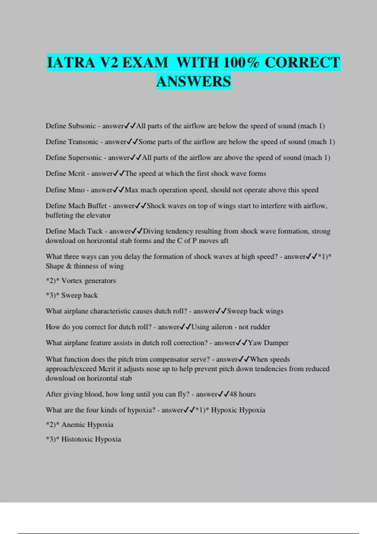 IATRA V2 EXAM WITH 100% CORRECT ANSWERS Define Subsonic - answerAll parts of the airflow are below the speed of sound (mach 1) Define Transonic - answerSome parts of the airflow are below the speed of sound (mach 1) Define Supersonic - answerAll parts of the airflow are above the speed of sound (mach 1) Define Mcrit - answerThe speed at which the first shock wave forms Define Mmo - answerMax mach operation speed, should not operate above this speed Define Mach Buffet - answerShock waves on top of wings start to interfere with airflow, buffeting the elevator Define Mach Tuck - answerDiving tendency resulting from shock wave formation, strong download on horizontal stab forms and the C of P moves aft What three ways can you delay the formation of shock waves at high speed? - answer*1)* Shape & thinness of wing *2)* Vortex generators *3)* Sweep back What airplane characteristic causes dutch roll? - answerSweep back wings
