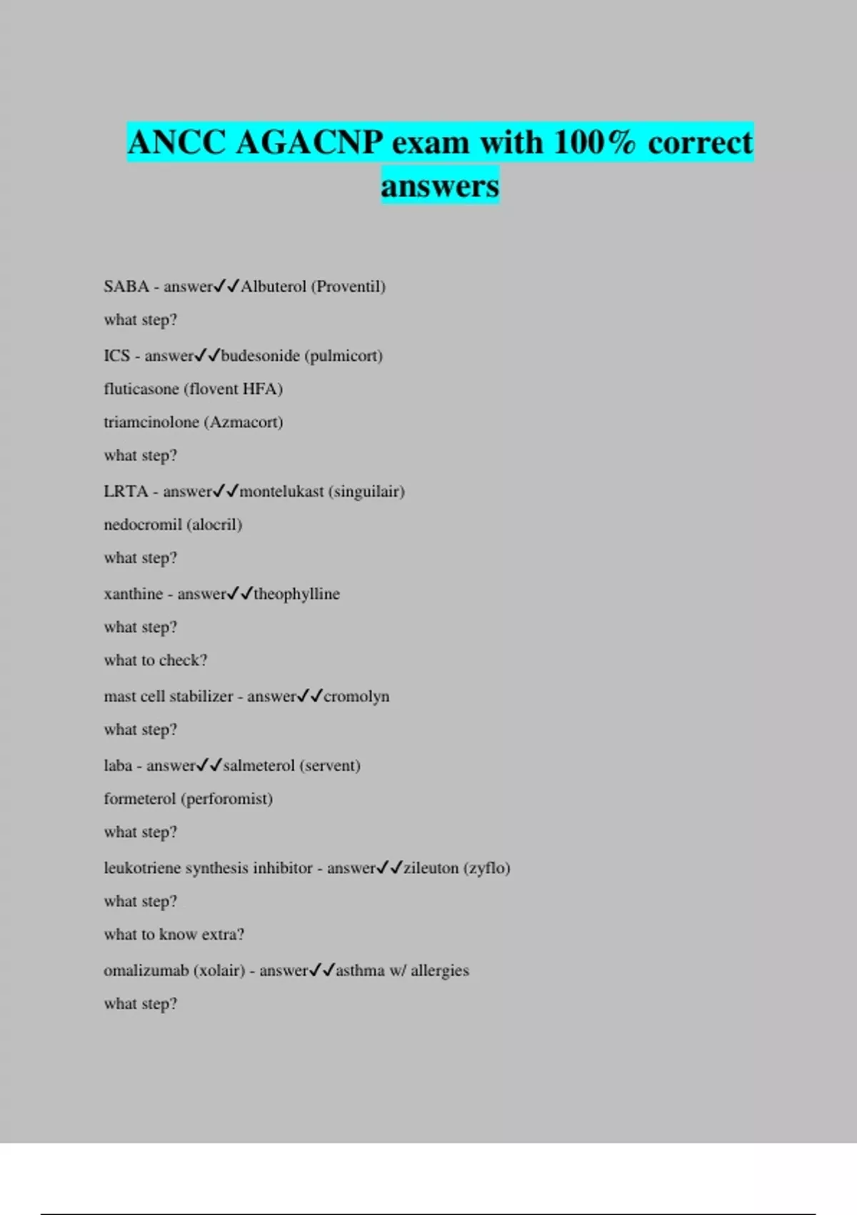 ANCC AGACNP exam with 100% correct answers SABA - answerAlbuterol (Proventil) what step? ICS - answerbudesonide (pulmicort) fluticasone (flovent HFA) triamcinolone (Azmacort) what step? LRTA - answermontelukast (singuilair) nedocromil (alocril) what step? xanthine - answertheophylline what step? what to check? mast cell stabilizer - answercromolyn what step? laba - answersalmeterol (servent) formeterol (perforomist) what step? leukotriene synthesis inhibitor - answerzileuton (zyflo) what step? what to know extra? omalizumab (xolair) - answerasthma w/ allergies what step? ipratropium (atrovent HFA) - answerinhaled anticholinergic for what? burn formula - answer4 ml/kg x TBSA (% burned) in 24 hours 1/2 fluid in 8 hrs remaining in 16 hours (1/4 next 8 hr, 1/4 remaining 8 hr) -use crystalloid -watch for hyperkalemia first 2 days, then hypokalemia s/p fluid resusc 3 days -watch metabolic acidosis early resusc phase DMARDS - answerfor ra (disease modifying antirheumatic drugs) corticosteroids methotrexate antimalarians (hydrochloroquine) gold salt injections IOP # - answernorm: 10-20 mm Hg serum fasting blood gluose - answerat least 8 hours, 126 mg/dL more than x1 cutaneous - answerlocal to skin or surface of body visceral - answerinternal organs ex. cholelithiasis somatic - answermuscles, bones, nerves, soft tissue ex. bone fx, breast removed neuropathic - answertumor, nerve pathway injury or compression ex. sciatica Amitriptyline (Elavil) - answer+- adjuvent for pain, helps w/ headache pain step 2 additions - answercodeine, hydrocodone, oxycodone, tramadol, dihidrocodeine pain step 3 additions - answerMORphine, hydroMORPhone, methadone, fentanyl epibole - answerrolled edges in pressure injury 3&4 celcius - answer37 c= 98.6, normal 38 c= 100.4 38.3 c = 101.5 trimethoprim-sulfamethoxazole - answerbactrim -can cause fever -for PCP prophylaxis, aids drugs that cause fever reactions - answerampho B bactrim beta-lactam abx procainamide (antiarrhyrhmic) isoniazid alpha-methyldopa quinidine (aniarrhythmic) -fever lingers, does not spike, tylenol ineffective tension headache - answerno neuro symptoms, relax w/ OTC migraine headache (2 types) - answerclassic- w/ aura common- w/o aur