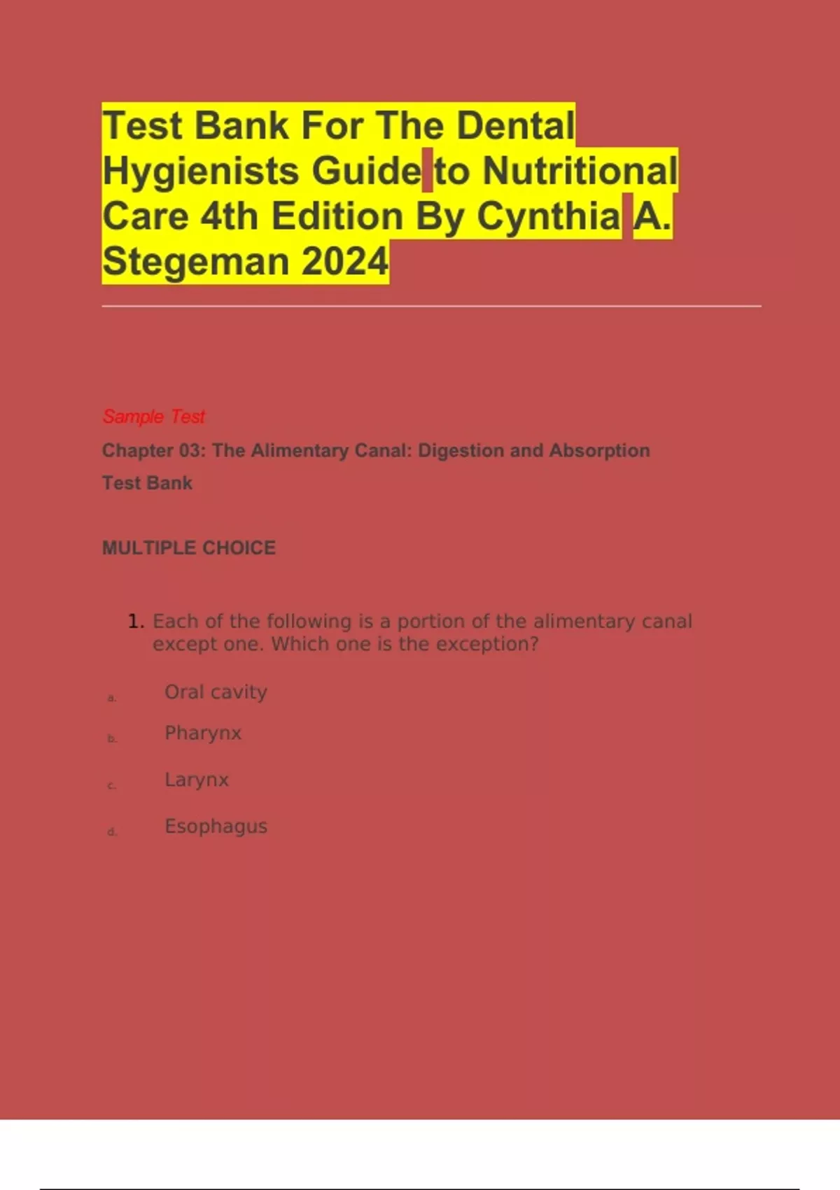 Test Bank For The Dental Hygienists Guide to Nutritional Care 4th Edition By Cynthia A. Stegeman 2024
