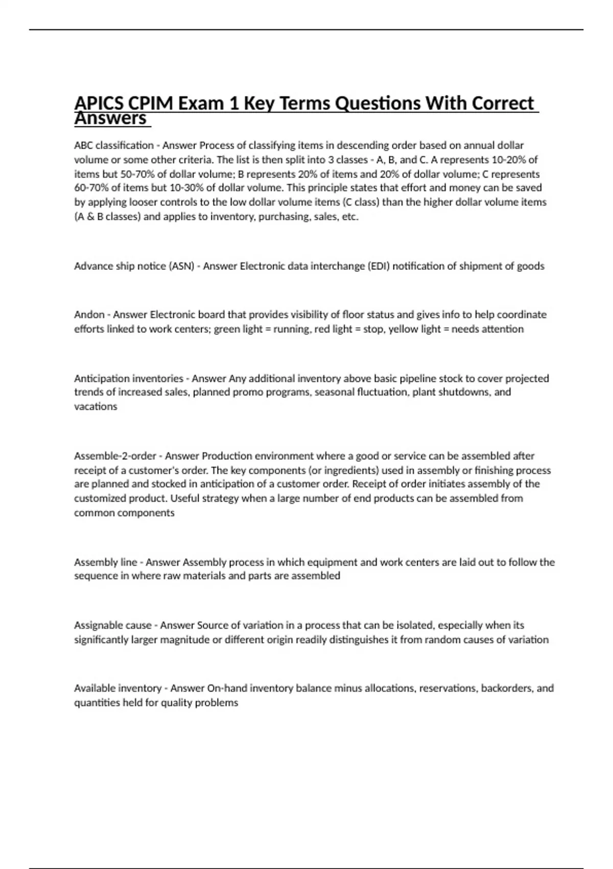 APICS CPIM Exam 1 Key Terms Questions With Correct Answers