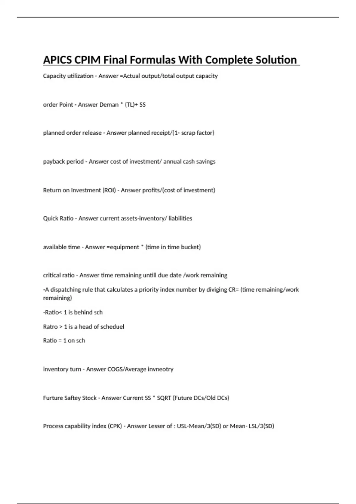 order Point Deman * (TL)+ SS utilization - Answer actual output/design capacity slack time - Answer =(current date - due date) - amount of time remaining on operation Saftey stock - Answer customer serice level * sqrt(( theta demand * Lead Time) + ((theata Lead Time * average demand)^2)) carrying cost - Answer =carry cost rate (avg inv) Time Availability - Answer = (Equipment) * (hours in time bucket) Contribution Margin Ratio - Answer Contribution Margin / Sales Payback Period - Answer investment/ annual cash savings Contribution Margin - Answer = Sales - Variable Costs Break even point in units - Answer fixed cost / contribution margin per unit Break even poiint (Dollars) - Answer fixed cost / CM Ratio Quality or utilization - Answer = perfects produced / total amount produced over all equipment effectivness - Answer = (available time)*(Efficency)*(utilization) Efficency - Answer standard hours/ actual hours Average inventory - Answer = (Current inventory + previous inventory)/ 2 performance efficency - Answer Standard hours/ actural hours back log - Answer = beginning back log + demand - supply customer service level - Answer = (orders per period - stock out chances per period)/(orders per period)