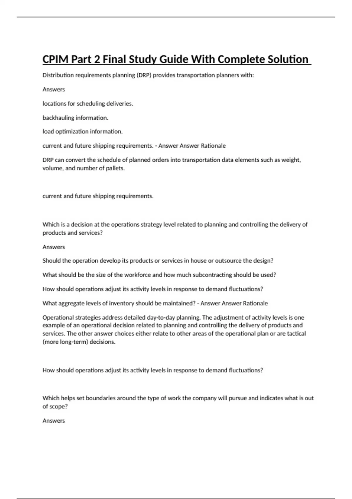 Distribution requirements planning (DRP) provides transportation planners with: Answers locations for scheduling deliveries. backhauling information. load optimization information. current and future shipping requirements. - Answer Answer Rationale DRP can convert the schedule of planned orders into transportation data elements such as weight, volume, and number of pallets. current and future shipping requirements. Which is a decision at the operations strategy level related to planning and controlling the delivery of products and services? Answers Should the operation develop its products or services in house or outsource the design? What should be the size of the workforce and how much subcontracting should be used? How should operations adjust its activity levels in response to demand fluctuations? What aggregate levels of inventory should be maintained? - Answer Answer Rationale Operational strategies address detailed day-to-day planning. The adjustment of activity levels is one example of an operational decision related to planning and controlling the delivery of products and services. The other answer choices either relate to other areas of the operational plan or are tactical (more long-term) decisions. How should operations adjust its activity levels in response to demand fluctuations? Which helps set boundaries around the type of work the company will pursue and indicates what is out of scope? Answers Project scope statement Vision Core values Mission - Answer Answer Rationale The APICS Dictionary, 16th edition, defines mission as "the overall goal(s) for an organization set within the parameters of the business scope." Mission What can happen when management fails to articulate a concise operational strategy that is aligned with overall corporate strategy? Answers Departmental "specialists" will tend to optimize their own areas of control without consideration for the rest of the organization. Enterprise resources planning (ERP) system accuracy will continue to be reliable because employee training is part of ERP system startup. Company-wide solutions will become a viable substitute for the weak operational strategy. IT security will likely fall victim to corporate espionage. - Answer Answer Rationale In the absence of a more explicit operations strategy, specialists in areas such as inventory control or process technology will tend to develop their own "systems" protecting their own organizational positions. Departmental "specialists" will tend to optimize their own areas of control without consideration for the rest of the organization. What is the primary purpose of a core values statement? Answers Emphasizes to shareholders the organization's commitment to ethical behavior Enhances recruitment of the right kind of employees Provides ethical and business guidepost to organization members Satisfies the needs of legal and regulatory stakeholders - Answer Answer Rationale While a core values statement can support recruitment, its primary function is for the existing members of the organization. It helps guide future business and ethical decisions. Provides ethical and business guidepost to organization members Strategies that lack stability over time and employee acceptance are the result of an organization not having which of the following? Answers Mission and vision Differentiation strategies Dependability and flexibility Big opportunities and eight accelerators - Answer Answer Rationale A business's mission, vision, and core values create a foundation for the organization's strategy by unifying leaders and employees behind a shared vision of the organization's principles and future. Without this foundation, strategies can lack stability over time and broad acceptance by executives, managers, and employees. Mission and vision Which quantitative forecasting technique applies past patterns of demand data covering introduction, growth, maturity, saturation, and decline of similar products to a new product family? Answers Concurrent forecasting Seasonality Life cycle analysis Trend - Answer Answer Rationale Life cycle analysis is a quantitative forecasting technique based on applying past patterns of demand data covering introduction, growth, maturity, saturation, and decline of similar products to a new product family. Life cycle analysis What is a strengths, weaknesses, opportunities, and threats (SWOT) analysis best used for? Answers Helping formulate and update the company's mission and vision statements Initiating discussions within the monthly sales and operations planning (S&OP) activity Identifying whether the company is in a position to pursue attractive market opportunities and defend against external threats Convincing venture capitalists to invest in a new business proposal - Answer Answer Rationale In evaluating a company's overall situation, a key question is whether the company is in a position to pursue attractive market opportunities and defend against external threats to its future well-being. Identifying whether the company is in a position to pursue attractive market opportunities and defend against external threats At a minimum, a company's key success factors should include which of the following? Answers Generous portions of narrative from the company's mission and vision statements Company's targeted year-end stock price Internal rate of return stated as a percent of earnings Those attributes or strengths with the greatest impact on future success in the marketplace - Answer Answer Rationale Key success factors are the product attributes, organizational strengths, and accomplishments that have the greatest impact on future success in the marketplace. Those attributes or strengths with the greatest impact on future success in the marketplace Threats to a company's future well-being often take the form of: Answers a smear campaign orchestrated by a nefarious competitor. a stock market adjustment. the entry of lower-cost foreign competitors. burdensome, oppre
