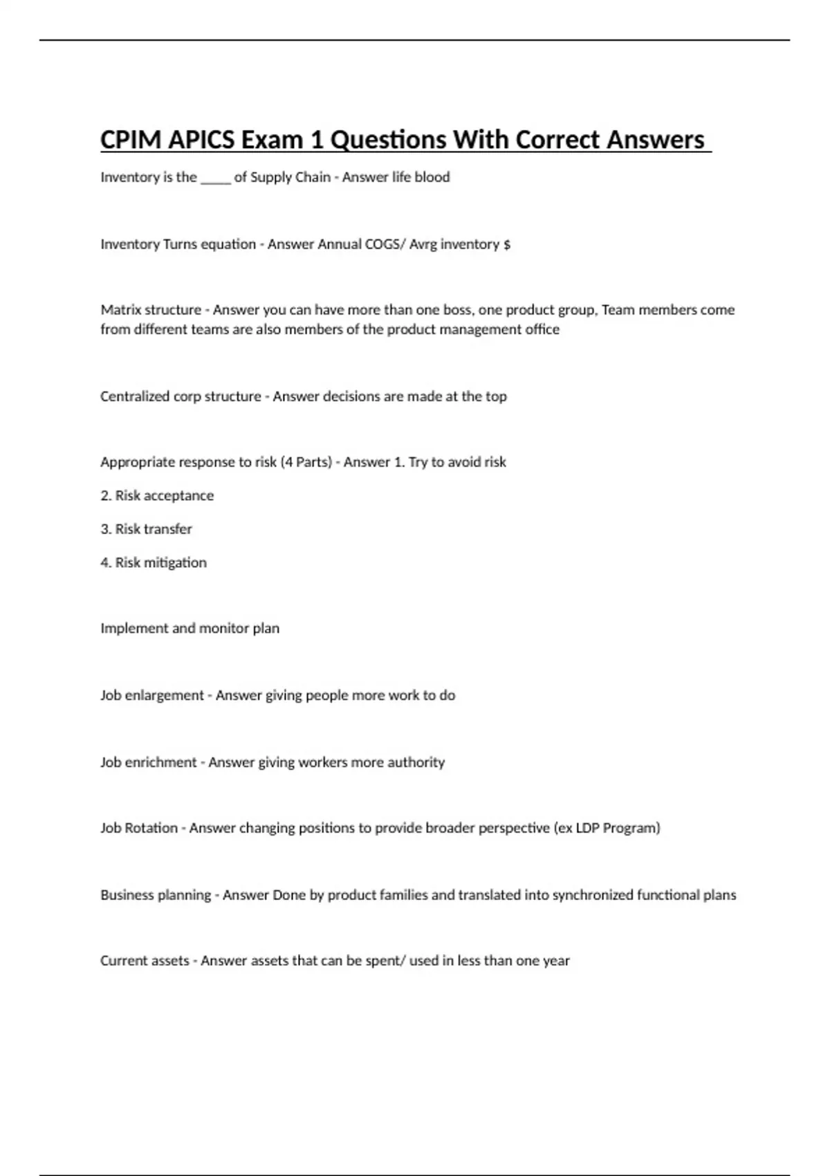 Inventory is the ____ of Supply Chain - Answer life blood Inventory Turns equation - Answer Annual COGS/ Avrg inventory $ Matrix structure - Answer you can have more than one boss, one product group, Team members come from different teams are also members of the product management office Centralized corp structure - Answer decisions are made at the top Appropriate response to risk (4 Parts) - Answer 1. Try to avoid risk 2. Risk acceptance 3. Risk transfer 4. Risk mitigation Implement and monitor plan Job enlargement - Answer giving people more work to do Job enrichment - Answer giving workers more authority Job Rotation - Answer changing positions to provide broader perspective (ex LDP Program) Business planning - Answer Done by product families and translated into synchronized functional plans Current assets - Answer assets that can be spent/ used in less than one year Inventory ratio (aka activity ratio) - Answer COGS/ Avrg Inventory Fixed assets examples - Answer gross property, plant and equipment Payback period - Answer cost of investment/ annual cash savings Manufacturing costs (aka direct costs) - Answer DM, DL, MOH Product cost is recognized when - Answer products are sold Period costs - Answer accrued at time of purchase, not included in COGS Variable costing is what kind of tool - Answer lean.. shows fixed OH on your income statement Job-Order costing - Answer this is made to order environment Process costing - Answer costs are collected for the period and averaged Strategy - Answer A plan to use the organizations resources to achieve a sustainable competitive advantage vision - Answer shared perception of the future, what the organization wants to become Mission - Answer overall goals within business scope Values - Answer organizational guideposts for all business and ethical decisions Generic Business strategies (5) - Answer 1. low-cost provider 2. Differentiation 3. Focused low-cost provider 4. Focused differentiation 5. Best-cost provider