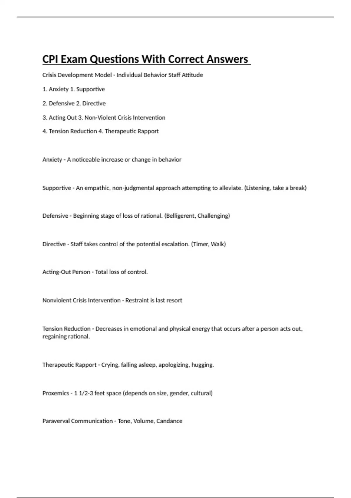 Crisis Development Model - Individual Behavior Staff Attitude 1. Anxiety 1. Supportive 2. Defensive 2. Directive 3. Acting Out 3. Non-Violent Crisis Intervention 4. Tension Reduction 4. Therapeutic Rapport Anxiety - A noticeable increase or change in behavior Supportive - An empathic, non-judgmental approach attempting to alleviate. (Listening, take a break) Defensive - Beginning stage of loss of rational. (Belligerent, Challenging) Directive - Staff takes control of the potential escalation. (Timer, Walk) Acting-Out Person - Total loss of control. Nonviolent Crisis Intervention - Restraint is last resort Tension Reduction - Decreases in emotional and physical energy that occurs after a person acts out, regaining rational. Therapeutic Rapport - Crying, falling asleep, apologizing, hugging. Proxemics - 1 1/2-3 feet space (depends on size, gender, cultural) Paraverval Communication - Tone, Volume, Candance Verbal Escalation Continuum - Question, Refusal, Release, Intimidation, Tension Reduction Questioning - Information seeking Challenging- questioning authority, evasive, attempting to draw staff in