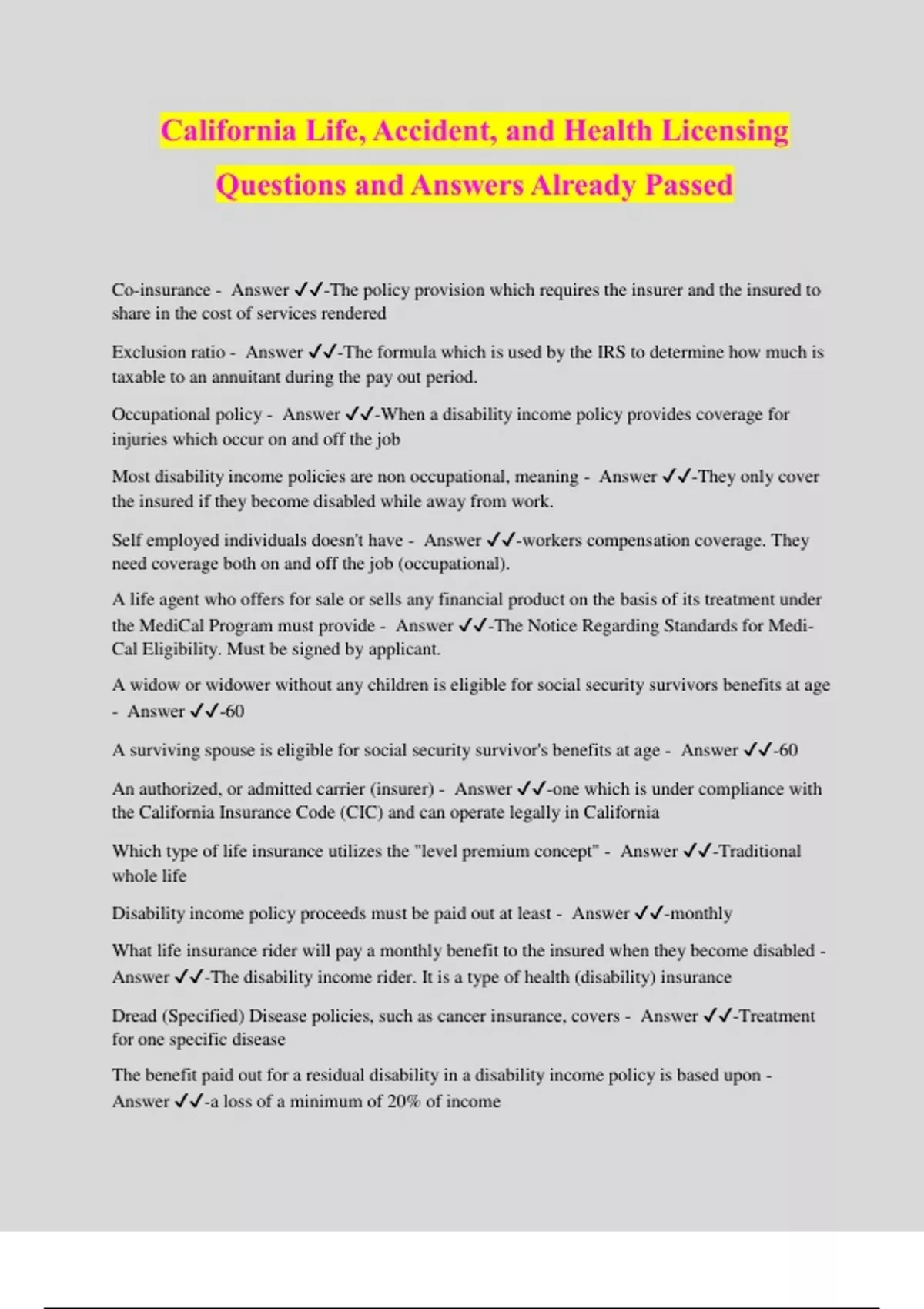 California Life, Accident, and Health Licensing Questions and Answers Already Passed Co-insurance - Answer ️️ -The policy provision which requires the insurer and the insured to share in the cost of services rendered Exclusion ratio - Answer ️️ -The formula which is used by the IRS to determine how much is taxable to an annuitant during the pay out period. Occupational policy - Answer ️️ -When a disability income policy provides coverage for injuries which occur on and off the job Most disability income policies are non occupational, meaning - Answer ️️ -They only cover the insured if they become disabled while away from work. Self employed individuals doesn't have - Answer ️️ -workers compensation coverage. They need coverage both on and off the job (occupational). A life agent who offers for sale or sells any financial product on the basis of its treatment under the MediCal Program must provide - Answer ️️ -The Notice Regarding Standards for Medi- Cal Eligibility. Must be signed by applicant. A widow or widower without any children is eligible for social security survivors benefits at age - Answer ️️ -60 A surviving spouse is eligible for social security survivor's benefits at age - Answer ️️ -60 An authorized, or admitted carrier (insurer) - Answer ️️ -one which is under compliance with the California Insurance Code (CIC) and can operate legally in California Which type of life insurance utilizes the "level premium concept" - Answer ️️ -Traditional whole life Disability income policy proceeds must be paid out at least - Answer ️️ -monthly What life insurance rider will pay a monthly benefit to the insured when they become disabled - Answer ️️ -The disability income rider. It is a type of health (disability) insurance Dread (Specified) Disease policies, such as cancer insurance, covers - Answer ️️ -Treatment for one specific disease The benefit paid out for a residual disability in a disability income policy is based upon - Answer ️️ -a loss of a minimum of 20% of income Agent may be either - Answer ️️ -Captive (Exclusive) or independent Captive agents - Answer ️️ -agents who agree by contract to represent only one insurer in the sale of insurance Independent agents - Answer ️️ -usually self-employed and often represent several insurance companies Under state law, agents must have at least - Answer ️️ -one appointment in order to keep their license active Agents are prohibited from engaging in any of the following activities - Answer ️️ -1. using a business name that implies that they are an insurer 2. advertising on behalf of a non-admitted insurer 3. offering free insurance as an inducement to purchase or sale Under a group insurance plan a certificate of insurance is issued to - Answer ️️ -the participants, usually employees. The policy owner, usually employer, gets the master policy Domestic insurer - Answer ️️ -one that domiciled (organized) in this state Foreign insurer - Answer ️️ -one that organized in another state Alien insurer - Answer ️️ -one that organized in another c