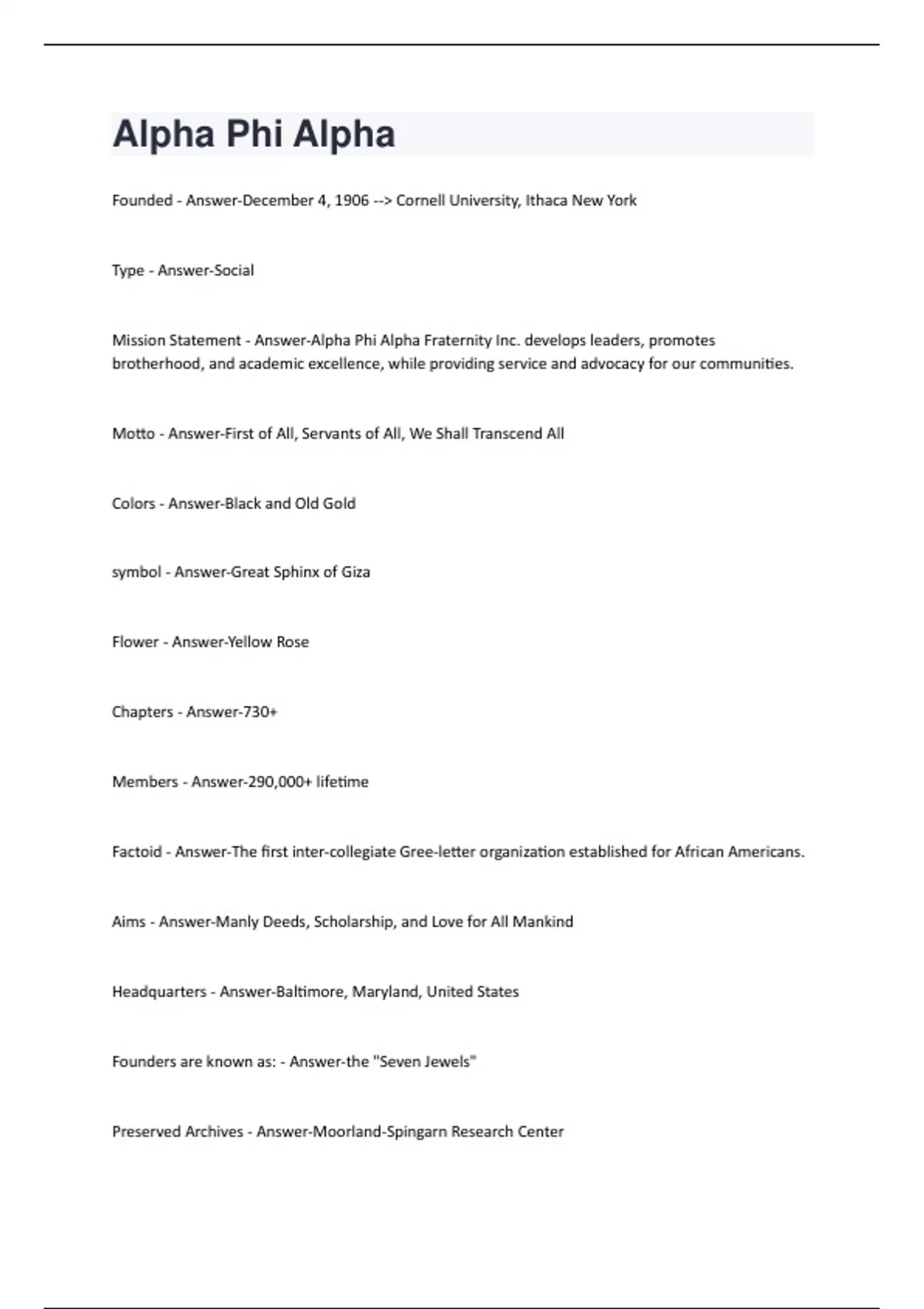 Founded - Answer-December 4, 1906 -- Cornell University, Ithaca New York Type - Answer-Social Mission Statement - Answer-Alpha Phi Alpha Fraternity Inc. develops leaders, promotes brotherhood, and academic excellence, while providing service and advocacy for our communities. Motto - Answer-First of All, Servants of All, We Shall Transcend All Colors - Answer-Black and Old Gold symbol - Answer-Great Sphinx of Giza Flower - Answer-Yellow Rose Chapters - Answer-730+ Members - Answer-290,000+ lifetime Factoid - Answer-The first inter-collegiate Gree-letter organization established for African Americans. Aims - Answer-Manly Deeds, Scholarship, and Love for All Mankind Headquarters - Answer-Baltimore, Maryland, United States Founders are known as: - Answer-the "Seven Jewels" Preserved Archives - Answer-Moorland-Spingarn Research CenterWhere are chapters charted? - Answer-Howard University and Virginia Union University in 1907 Active chapters located ? - Answer-Americas, Africa, Europe, the Caribbean, and Asia Alpha Phi Alpha evolved into a primarily service organization and provided leadership and service during : - Answer-Great Depression, World Wars, and Civil Rights Movements It addresses social issues such as: - Answer-apartheid, AIDS, urban housing, and other economic, cultural, and political issues of interest to people of color. Programs of Alpha Phi Alpha - Answer-The Martin Luther King, Jr. National Memorial and World Policy Council. March of Dimes, Head Start, Boy Scouts of America, and Big Brothers Big Sisters of America. Members of Alpha Phi Alpha include: (not the founder) - Answer-Jamaican Prime Minister Norman Manley, Nobel Prize winner Martin Luther King, Jr., Olympian Jesse Owens, Justice Thurgood Marshall, United Nations Ambassador Andrew Young, Singer Lionel Richie and Atlanta Mayor Maynard Jackson. Preamble - Answer-To promote a more perfect union among college men; to aid in and insist upon the personal progress of its members; to further brotherly love and a fraternal spirit within the organization; to discountenance evil; to destroy all prejudices; to preserve the sanctity of the home, the personification of virtue and the chastity of woman. Omega - Answer-The End . Deceased brothers are said to have joined Omega Chapter. Founders Jones and Murray chartered the second and third chapters, at: - Answer-Howard University and Virginia Union University, respectively, in December 1907. The charter at __________made it the site of the organization of the first black Greek letter organization among historically black colleges - Answer-Howard University The purpose and objective of the fraternity within the articles of incorporation were declared : - Answer-"educational and for the mutual uplift of its members." The fraternity chartered its first international chapter at: - Answer-University of Toronto in 1908The first general convention assembled in December 1908 at: - Answer-Howard University in Washington D.C The First General Covention - Answer-producing the first ritual and the election of the first General President of Alpha Phi Alpha, Moses A. Morrison. First General President of Alpha Phi Alpha - Answer-Moses A. Morrison