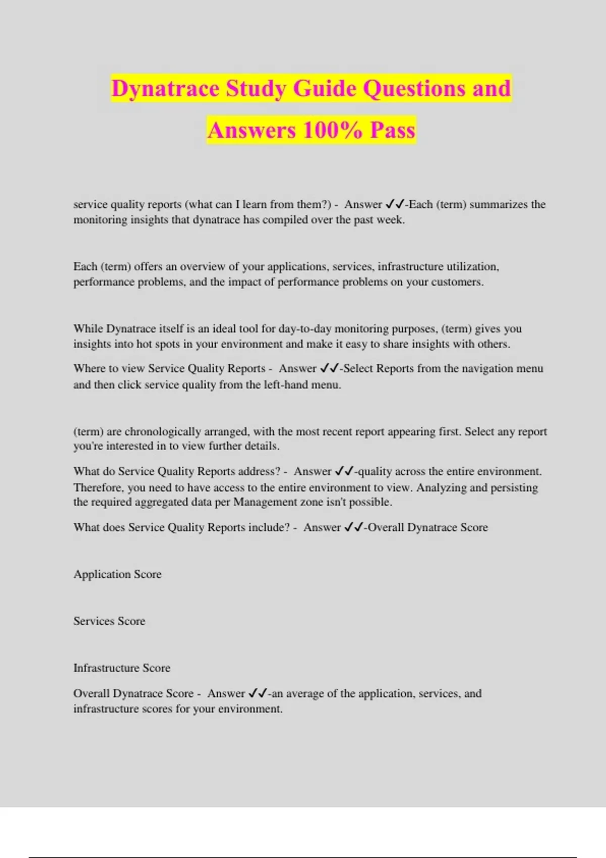 Dynatrace Study Guide Questions and Answers 100% Pass service quality reports (what can I learn from them?) - Answer ️️ -Each (term) summarizes the monitoring insights that dynatrace has compiled over the past week. Each (term) offers an overview of your applications, services, infrastructure utilization, performance problems, and the impact of performance problems on your customers. While Dynatrace itself is an ideal tool for day-to-day monitoring purposes, (term) gives you insights into hot spots in your environment and make it easy to share insights with others. Where to view Service Quality Reports - Answer ️️ -Select Reports from the navigation menu and then click service quality from the left-hand menu. (term) are chronologically arranged, with the most recent report appearing first. Select any report you're interested in to view further details. What do Service Quality Reports address? - Answer ️️ -quality across the entire environment. Therefore, you need to have access to the entire environment to view. Analyzing and persisting the required aggregated data per Management zone isn't possible. What does Service Quality Reports include? - Answer ️️ -Overall Dynatrace Score Application Score Services Score Infrastructure Score Overall Dynatrace Score - Answer ️️ -an average of the application, services, and infrastructure scores for your environment. Application Score - Answer ️️ -based on application Apdex ratings. In brief, the Application score is the average of your application Apdex value and the percentage of user actions that are not affected by problems. Services Score - Answer ️️ -represents the percentage of service calls that were successful and unaffected by problems. Infrastructure Score - Answer ️️ -the percentage of host time during which no problems were encountered. How often are Service Quality Reports generated? - Answer ️️ -each week on Sundays at midnight, so that when you start your work wee