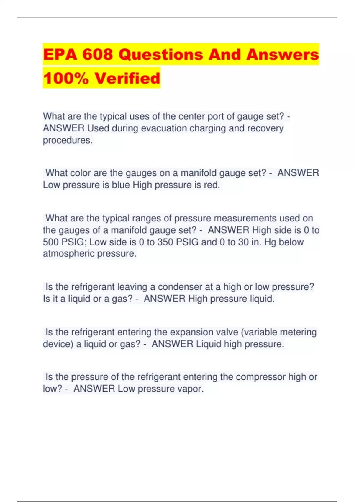 EPA 608 Questions And Answers 100% Verified What are the typical uses of the center port of gauge set? - ANSWER Used during evacuation charging and recovery procedures. What color are the gauges on a manifold gauge set? - ANSWER Low pressure is blue High pressure is red. What are the typical ranges of pressure measurements used on the gauges of a manifold gauge set? - ANSWER High side is 0 to 500 PSIG; Low side is 0 to 350 PSIG and 0 to 30 in. Hg below atmospheric pressure. Is the refrigerant leaving a condenser at a high or low pressure? Is it a liquid or a gas? - ANSWER High pressure liquid. Is the refrigerant entering the expansion valve (variable metering device) a liquid or gas? - ANSWER Liquid high pressure. Is the pressure of the refrigerant entering the compressor high or low? - ANSWER Low pressure vapor. Where in a refrigerant circuit does a liquid boil to absorb heat? - ANSWER In the evaporator. The refrigerant in the suction line is a gas that has been heated above its saturation. What is this condition called? - ANSWER Superheated vapor. What can cause liquid refrigerant to migrate to a compressor crankcase? - ANSWER If the compressor is located in the coldest location in the circuit. List two conditions that can quickly damage a compressor that is starting to run? - ANSWER Operating while in a deep vacuum or when the service valves are closed. What system failures require taking an oil sample? - ANSWER A compressor burnout or if the unit has had a leak. Is flushing with refrigerant an acceptable tube cleaning method? - ANSWER No. In addition to preventing and repairing leaks - ANSWER what else should a technician do to conserve refrigerant? Recover and recycle used refrigerants. What factors affect the speed of an evacuation? - ANSWER Pump size hose length hose diameter size of system to be evacuated ambient temperature suction line size and the amount of moisture in the system. How should gauge set hoses be sized for use in evacuating a system? - ANSWER Use the shortest length and the largest diameter possible for the quickest evacuation. At least as large as the vacuum pump inlet. When evacuating - ANSWER what is the benefit of using short hoses with large diameters? Reduces emissions pressure drop and evacuation time. which connection determines the preferred size of hoses used with a vacuum pump? - ANSWER The vacuum pump inlet.