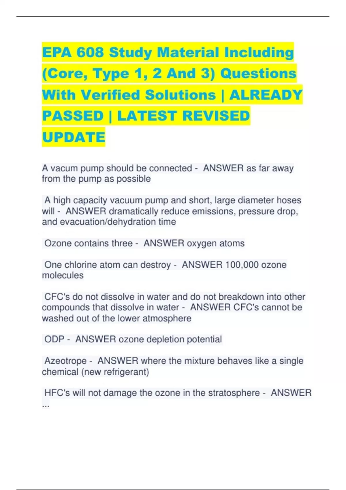 EPA 608 Study Material Including (Core, Type 1, 2 And 3) Questions With Verified Solutions | ALREADY PASSED | LATEST REVISED UPDATE A vacum pump should be connected - ANSWER as far away from the pump as possible A high capacity vacuum pump and short, large diameter hoses will - ANSWER dramatically reduce emissions, pressure drop, and evacuation/dehydration time Ozone contains three - ANSWER oxygen atoms One chlorine atom can destroy - ANSWER 100,000 ozone molecules CFC's do not dissolve in water and do not breakdown into other compounds that dissolve in water - ANSWER CFC's cannot be washed out of the lower atmosphere ODP - ANSWER ozone depletion potential Azeotrope - ANSWER where the mixture behaves like a single chemical (new refrigerant) HFC's will not damage the ozone in the stratosphere - ANSWER ... In 1992 the united states ordered the stoppage of all CFC production and importation after - ANSWER December 31, 1995 According to the clean air act, no person installing, maintaining, repairing, or disposing of any appliance may knowingly vent or otherwise release into the environment and class 1 or class 2 substance after - ANSWER July 1, 1992 class 1 - ANSWER CFC class 2 - ANSWER HCFC It became illegal to vent substitutes for CFC and HCFC refridgerants on - ANSWER November 15, 1995 Any device which contains and uses a class 1 or class 2 substance as a refridgerant and is used for household or commercial purpose. - ANSWER appliance Self contained recovery equipment type - ANSWER Active System dependent recovery equipment type - ANSWER Passive Only section 609 certified technicians may buy CFC-12 in containers smaller than 20 pounds - ANSWER ... Who must ensure that all refridgerant has been recovered prior to disposal of any appliance - ANSWER The final person in the disposal chain (scrap metal recycler, landfill owner, ect.) The removal of refridgerant in any condition - ANSWER Recovery To clean refridgerant by oil seperation, non-condensable removal and single or multiple passes through replaceable filter-driers to reduce moisture, acidity and particulate matter - ANSWER Recycling A complicated distillation process that returns recovered refridgerant to the purity of factory fresh refridgerant. - ANSWER Reclaiming (ARI Standard 700) Under no circumstance should different refridgerants be - ANSWER mixed together Currently there is NOT a drop-in for CFC-12 - ANSWER ... Oils that are hygroscopic - ANSWER Ester based (polyolesters) The alkylbenzene, use for some ternary blends - ANSWER ...