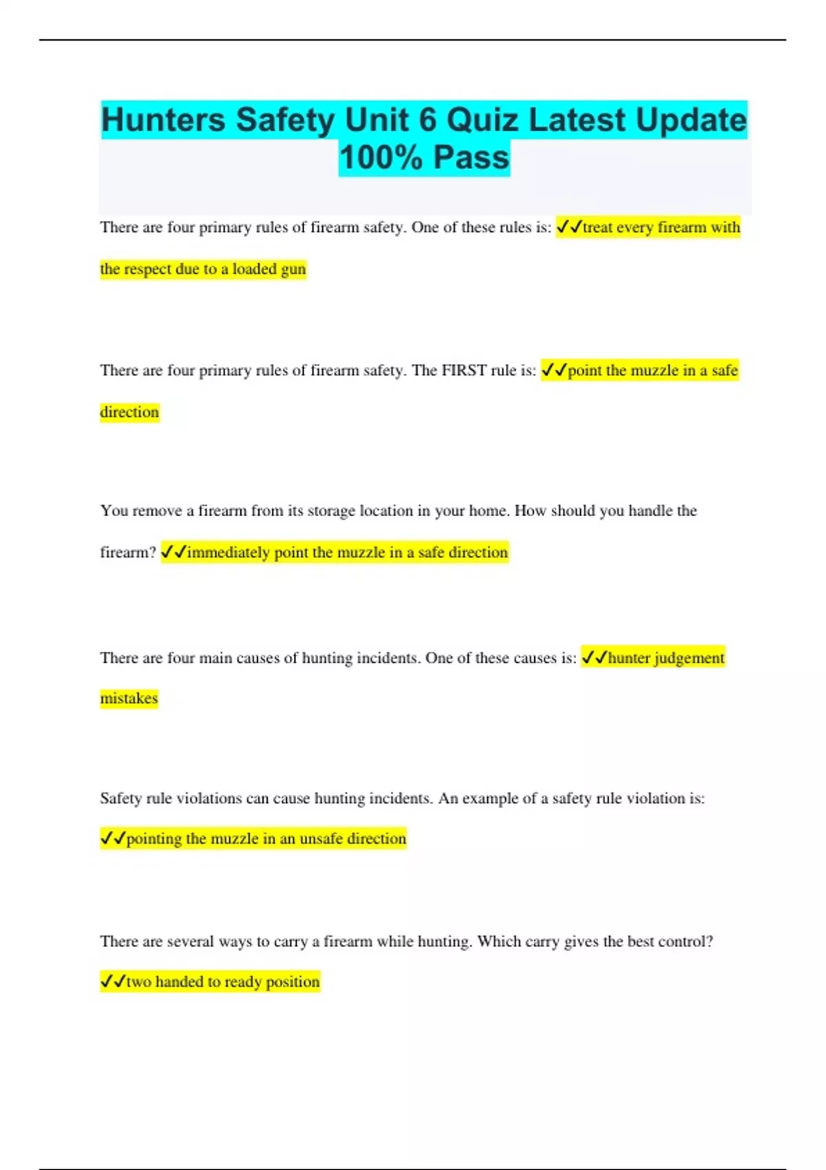Hunters Safety Unit 6 Quiz Latest Update 100% Pass There are four primary rules of firearm safety. One of these rules is: treat every firearm with the respect due to a loaded gun There are four primary rules of firearm safety. The FIRST rule is: point the muzzle in a safe direction You remove a firearm from its storage location in your home. How should you handle the firearm? immediately point the muzzle in a safe direction There are four main causes of hunting incidents. One of these causes is: hunter judgement mistakes Safety rule violations can cause hunting incidents. An example of a safety rule violation is: pointing the muzzle in an unsafe direction There are several ways to carry a firearm while hunting. Which carry gives the best control? two handed to ready position There are several ways to carry a gun. The shoulder carry is a good choice: if all hunters are in front of you You are hunting with others. Which two factors are most important in choosing how to carry your firearm? muzzle control and terrain When should a firearm be unloaded? when crossing a fence You stumble in the field. The barrel of your firearm dips into the ground. You follow the steps to check for an obstruction in the firearm. After pointing the muzzle in a safe direction, what is the NEXT step? unload the firearm What is the first step for both loading and unloading a firearm? point the muzzle in a safe direction Three hunters are hunting in a group, side by side. Which of the hunters need to be aware of the safe zones-of-fire? all three of the hunters Three hunters are walking side by side hunting pheasants. Which of the following is a safe and proper practice? each hunter shoots only at pheasant in his shooting range A hunter who drinks alcohol before or during the hunt is more likely to: have a hunting accident What is one DISADVANTAGE of hunting from an elevated stand? you can fall out of thr stand Which is the safest device to use while climbing a tree or in a tree stand? full body harness What should be worn at all times while climbing a tree or in a tree stand? fall arrest system You need to haul your firearm into a tree stand. What is the first step you should take? unload the firearm and check the action Two hunters are duck hunting in a boat. What is the safest position? back to back Which of the following is a symptom of hypothermia? weak hearbeat