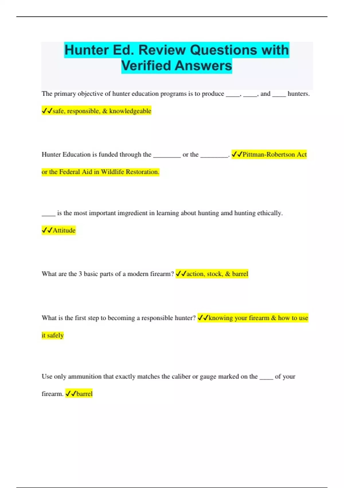 Hunter Ed. Review Questions with Verified Answers