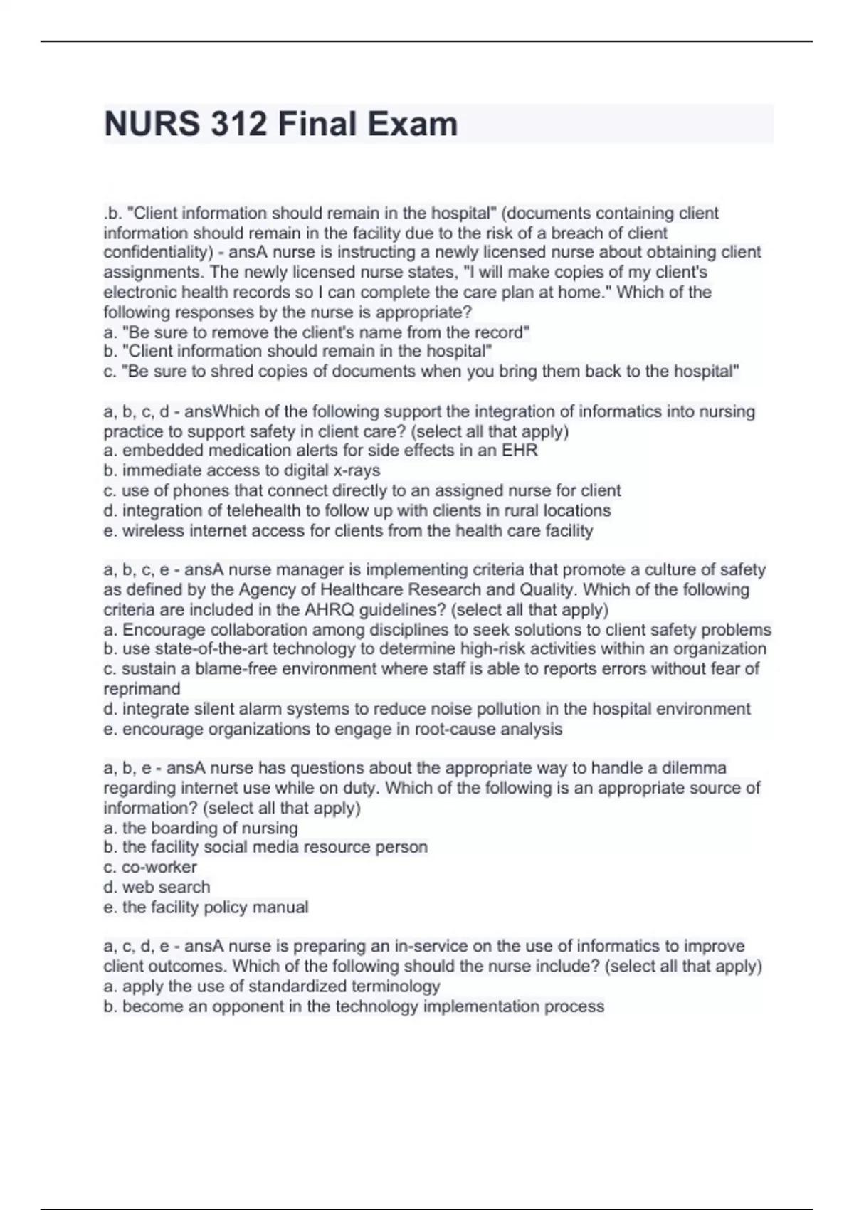 .b. "Client information should remain in the hospital" (documents containing client information should remain in the facility due to the risk of a breach of client confidentiality) - ansA nurse is instructing a newly licensed nurse about obtaining client assignments. The newly licensed nurse states, "I will make copies of my client's electronic health records so I can complete the care plan at home." Which of the following responses by the nurse is appropriate? a. "Be sure to remove the client's name from the record" b. "Client information should remain in the hospital" c. "Be sure to shred copies of documents when you bring them back