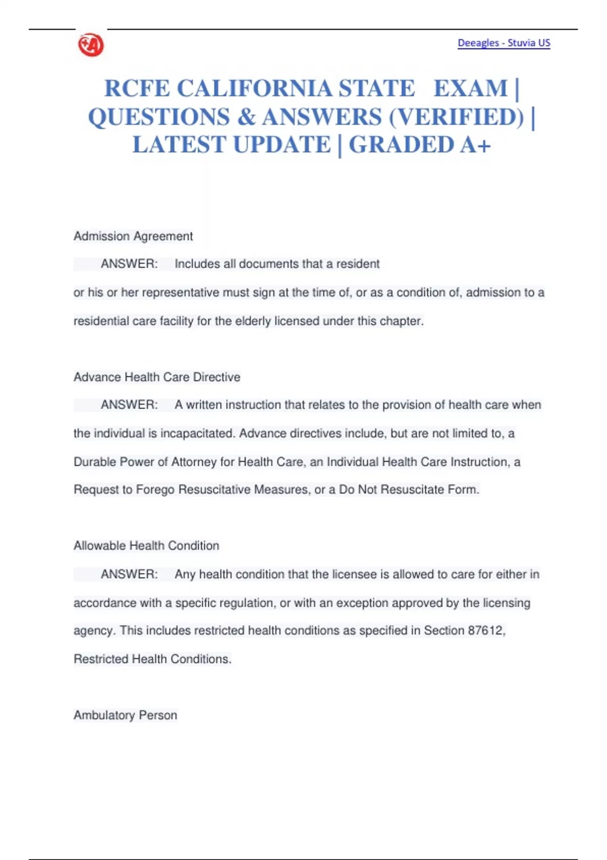 Admission Agreement ANSWER: Includes all documents that a resident or his or her representative must sign at the time of, or as a condition of, admission to a residential care facility for the elderly licensed under this chapter. Advance Health Care Directive ANSWER: A written instruction that relates to the provision of health care when the individual is incapacitated. Advance directives include, but are not limited to, a Durable Power of Attorney for Health Care, an Individual Health Care Instruction, a Request to Forego Resuscitative Measures, or a Do Not Resuscitate Form. Allowable Health Condition ANSWER: Any health condition that the licensee is allowed to care for either in accordance with a specific regulation, or with an exception approved by the licensing agency. This includes restricted health conditions as specified in Section 87612, Restricted Health Conditions